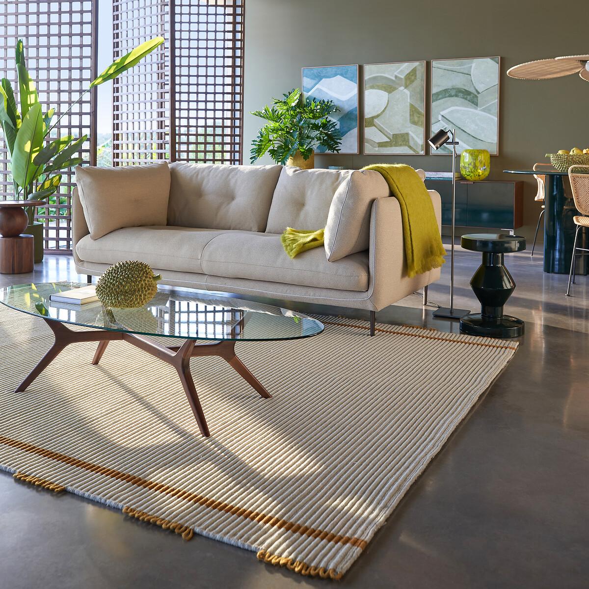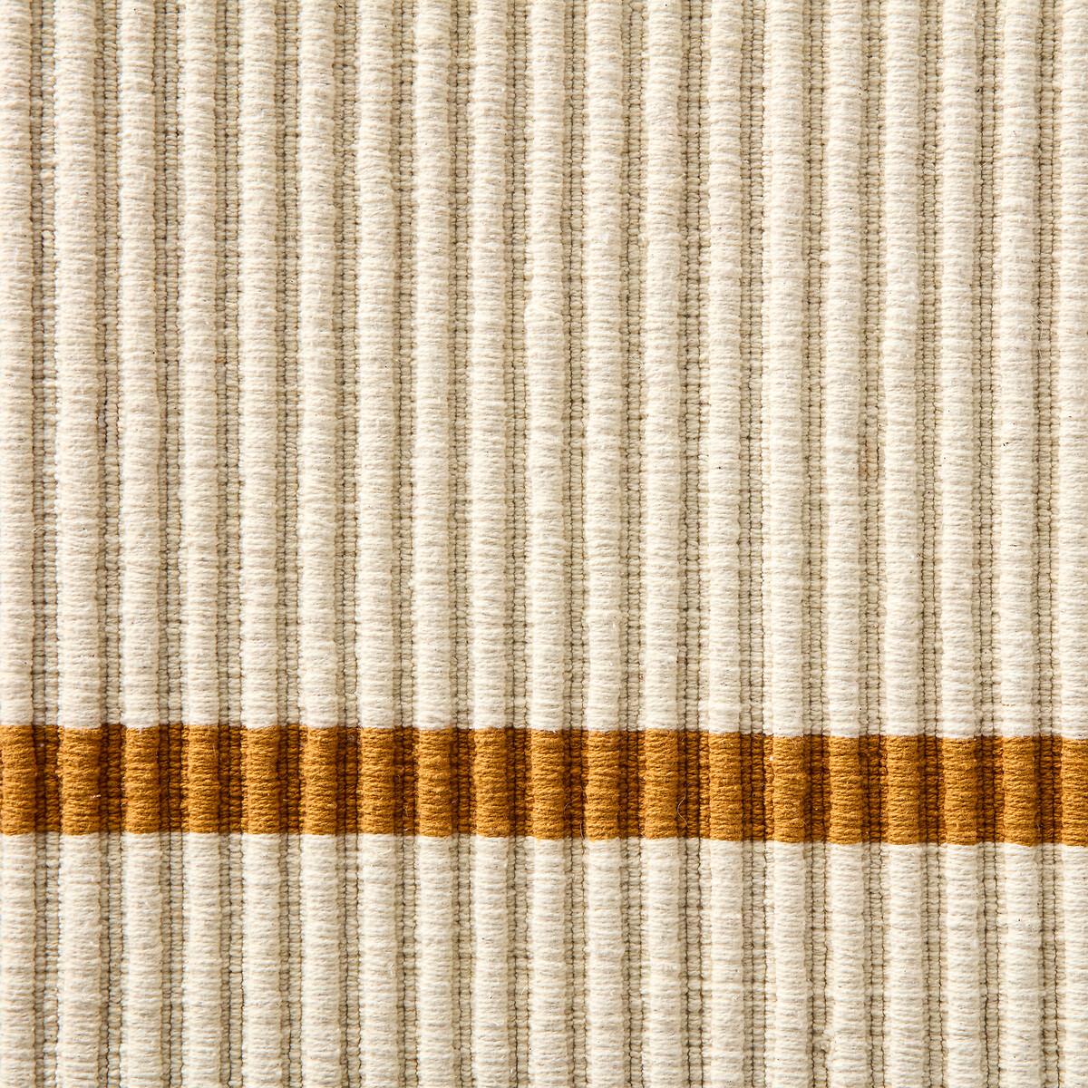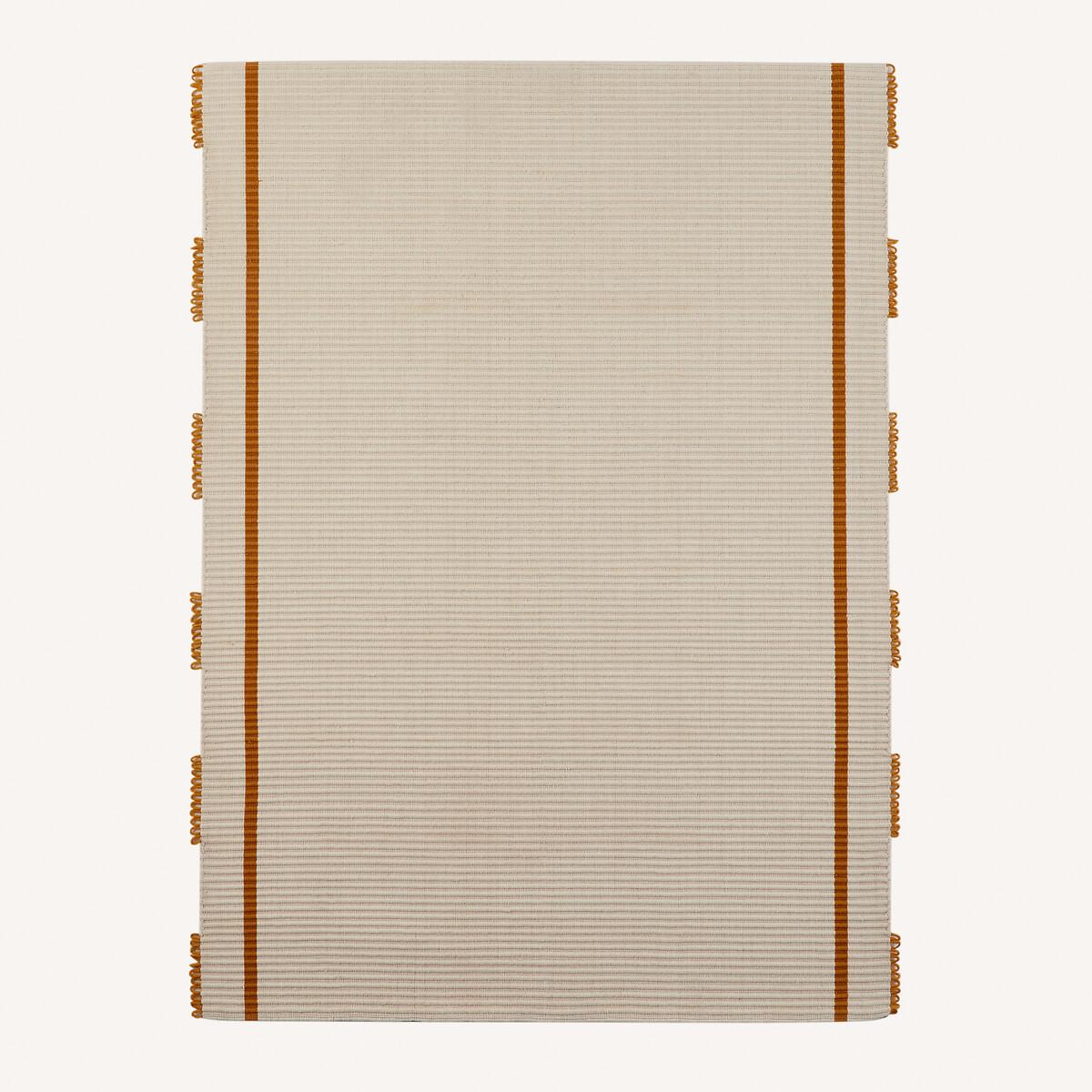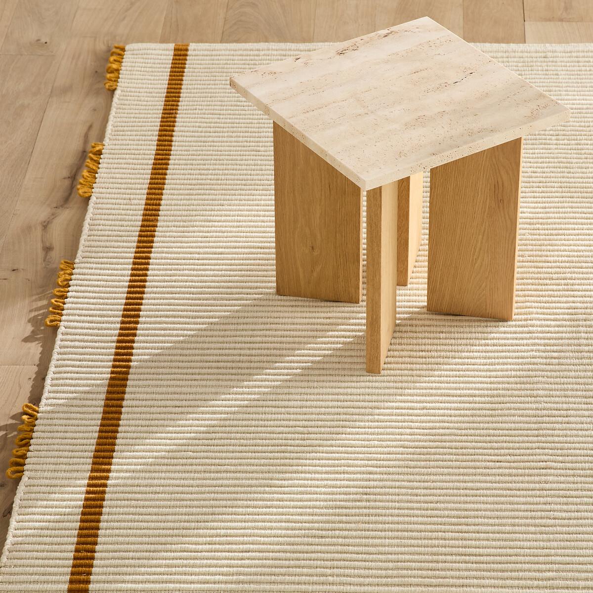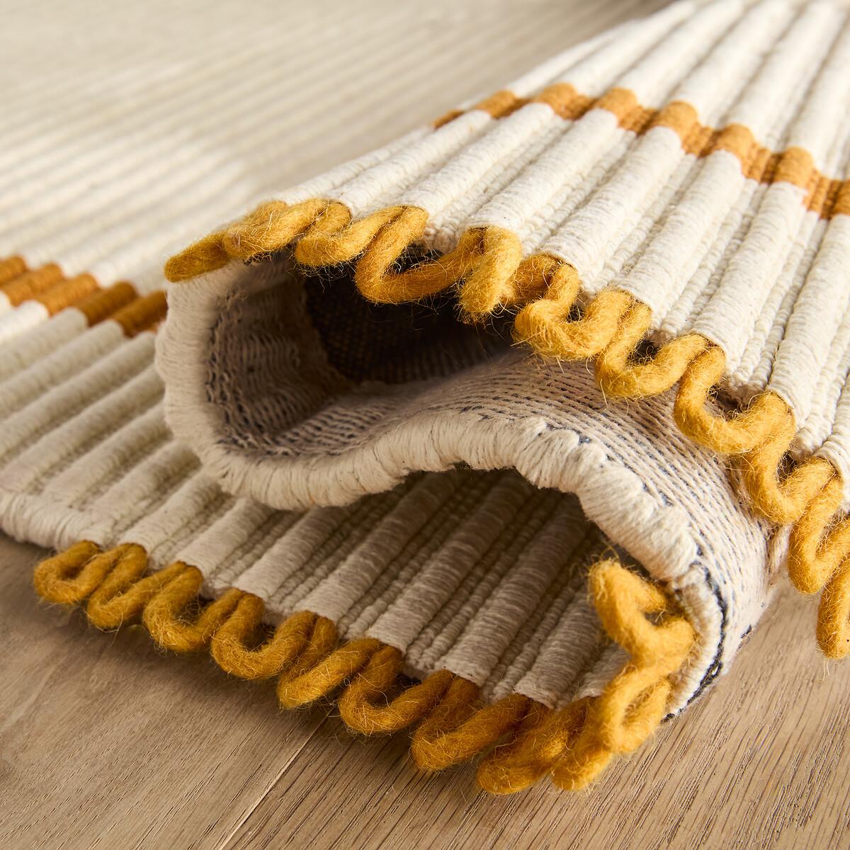 This hand-woven rug, with its light tones and contemporary design, evokes the softness of summer days and the simplicity of a beach mat. Energised by its stripes and the ochre loops that punctuate its edges, it combines a graphic spirit with traditional craftsmanship. All our rugs are handcrafted, a guarantee of quality and uniqueness. Real decorative elements, thermal and sound insulators, they warm the atmosphere. Product Details • 67% cotton, 23% wool, 7% polyamide, 3% polyester • Craftsmanship: hand woven • Weight: 1600g/m² • Pile height: Flat woven. Quality Info • Cotton is soft to the touch and fluffy. This cotton rug is a good heat and sound insulator. Dimensions • Width 120 x Length 180cm • Width 160 x Length 230cm • Width 200 x Length 290cmDelivery:. Available for home delivery.
