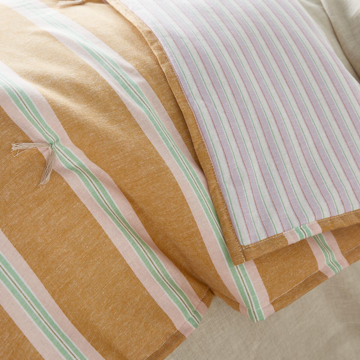 A graphic composition, a combination of stripes and variation of colours... The Vence quilt made from a cotton/linen fabric will help create a country atmosphere in the bedroom. Cotton & linen fabric combines the softness of cotton and the raw appearance of linen. Its crumpled appearance does not require ironing. Product Details • Cover 90% cotton, 10% linen • Padding 100% polyester, 120g/m² • Front: Wide stripe pattern • Back: Narrow stripe pattern • Edge-to-edge finish. Care Advice • Machine washable at 40°C • By washing your laundry at 30°C instead of 40°C, you limit energy consumption. Dimensions • Square: 150 x 150cm • Rectangular: 90 x 190cm • OEKO-TEX® Standard 100. Standard 100 certification by OEKO-TEX® tests textile products for harmful substances via an independent, international label.