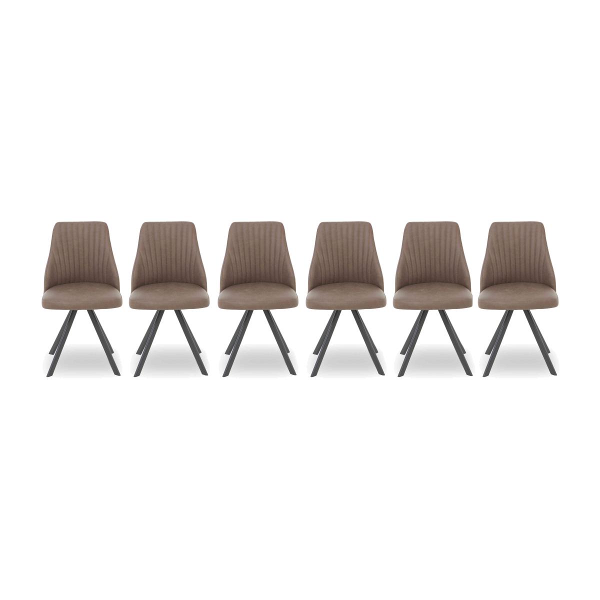Glamour with a distinctive modern edge? You’ll find precisely that in our Vida collection of dining tables, dining sets and sideboards. Offered in a choice of two marble-effect ceramic finishes – sophisticated grey and traditional Carrara – the range’s extending dining tables and bar tables combine high-gloss surfaces with angled powder-coated metal bases. Sumptuously cushioned and upholstered, Vida swivel dining chairs and bar stools add more than a touch of luxury to any dining space. With its sleek style and seamless functionality in the form of effortless table extension mechanisms and self-returning swivel chair bases, our Vida range redefines glam style for the modern home. Transform your dining room with this set of six urban glam dining chairs. With handy self-returning swivel bases and in a choice of upholstery colours, they’re the perfect fit. Why you'll love it Stylish swivel dining chairs deliver modern glam style. Soft faux leather upholstery in a choice of colours. Comfortably shaped seat backs with elegant vertical stitching. Self-returning chair bases – they swivel 180° and then swivel back into place. Black powder-coated steel legs have a textured finish. Also available in sets of 2 and 4 dining chairs. This set of 6 swivel dining chairs is part of the Vida range. What you need to know Foam seat cushioning. Part of our modern glam Vida collection of dining room furniture.