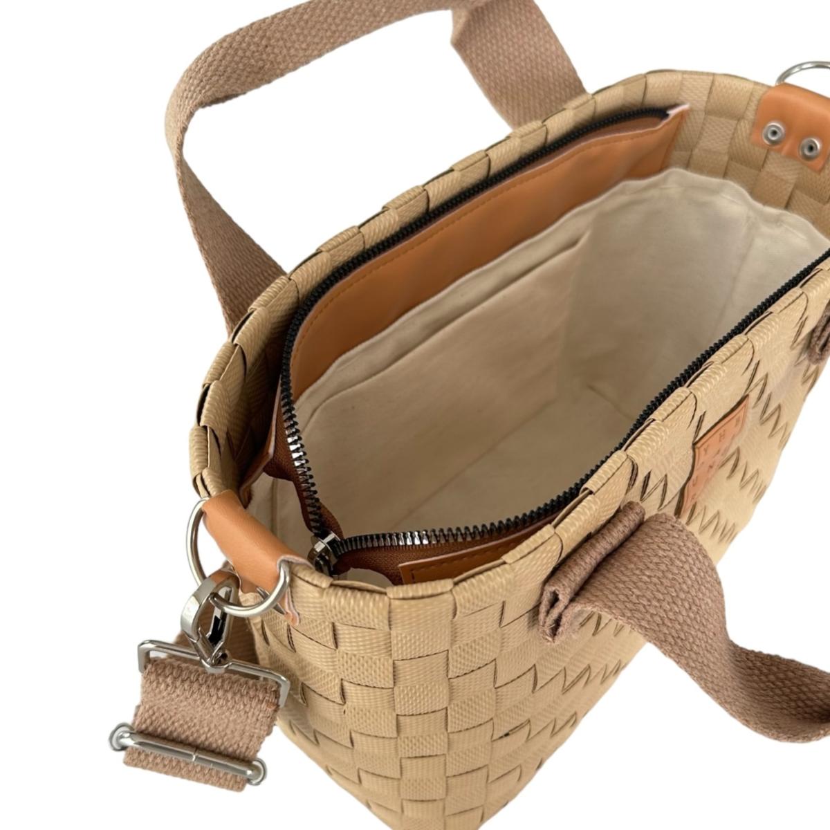 Durable and lightweight basket bag knitted by hand from recycled plastic! It offers safe use with its cotton inner lining and is easy to clean. It is ready to become your favorite piece thanks to its useful inner pocket detail and adjustable cotton column straps! You can do a favor for nature by choosing this bag produced with environmental awareness!