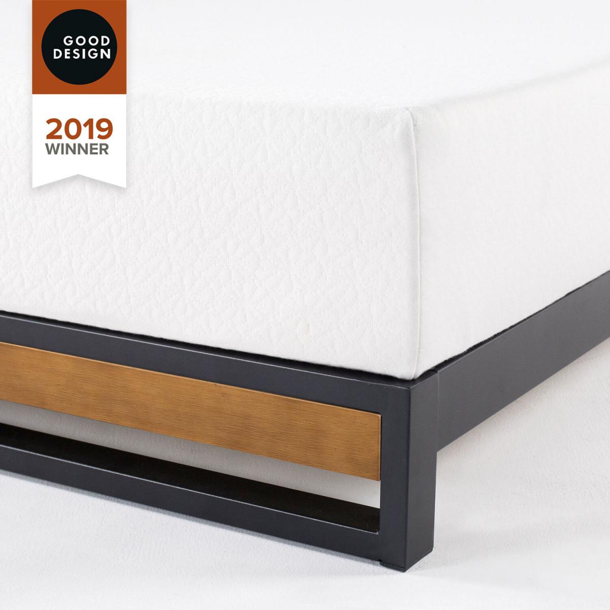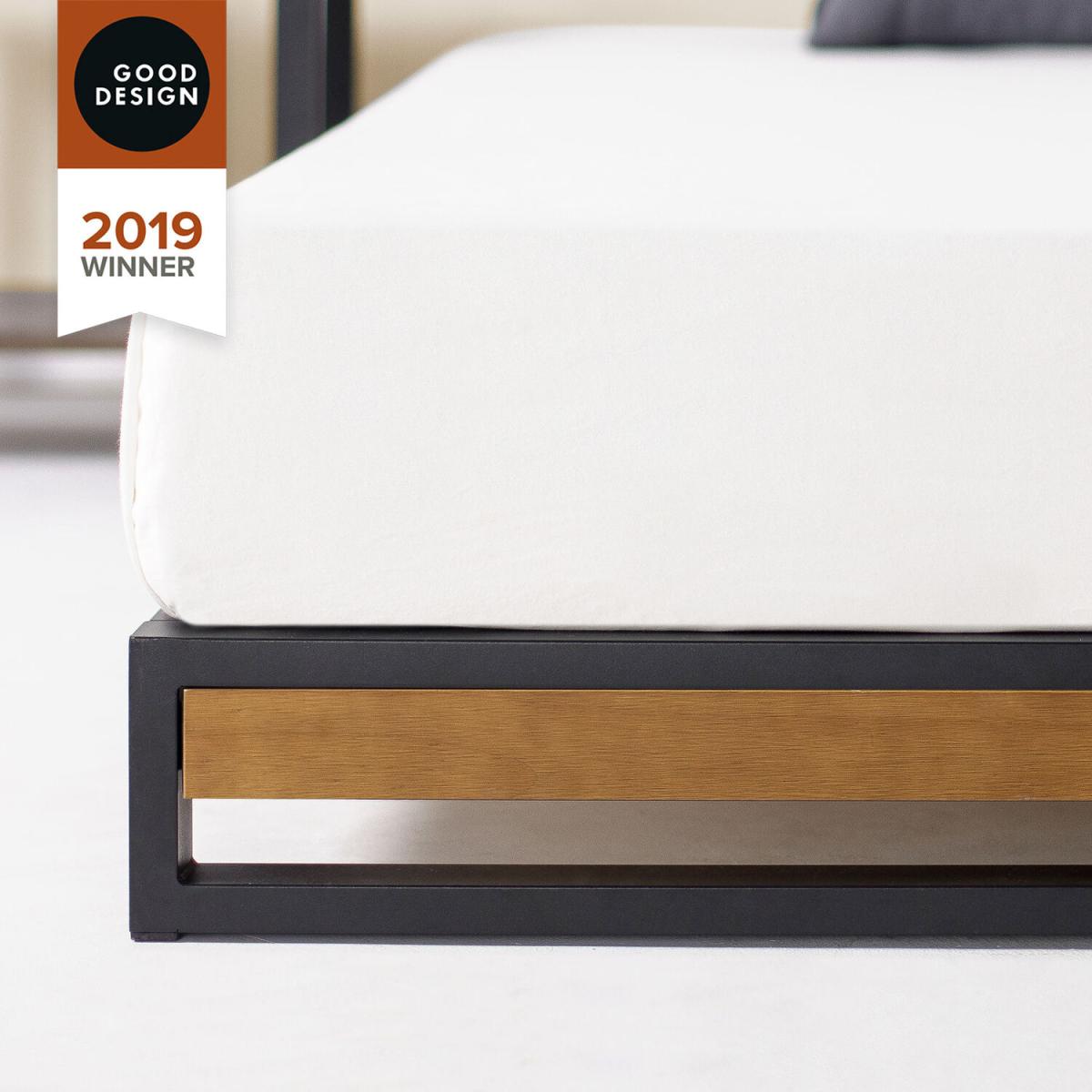 Modern Design Bed Frame. Sleek, sturdy, and designed with a modern-industrial spin, this bed frame takes the hard work out of looking good. Made with a wooden footboard and bold metal structure, this bestseller is surprisingly simple to set-up, and delivered to your door with everything you need for assembly in under an hour. In fact, this 2019 GOOD DESIGN Award Winner has earned recognition for its elevated style, durable structure, box-spring eliminating platform and efficient, all-in-one-box packaging. Strong, beautiful, and award-winning - a sleep scape trifecta. GOOD DESIGN AWARD WINNER - Awarded by the Chicago Athenaeum Museum of Architecture and Design in 2019 for outstanding design and packagingMODER N INDUSTRIAL DESIGN Wooden footboard coupled with a black steel frame offers a sleek, industrial inspired look NOISE FREE - Wooden slats designed to minimize noise when you sleep and designed to extend the life of your mattress EXPERTLY PACKAGED - All parts, tools and instructions are skillfully packed into one box for easy assembly in under an hourWORR Y FREE five-year limited warranty included. Mattress sold separately