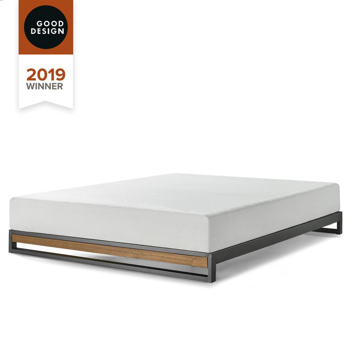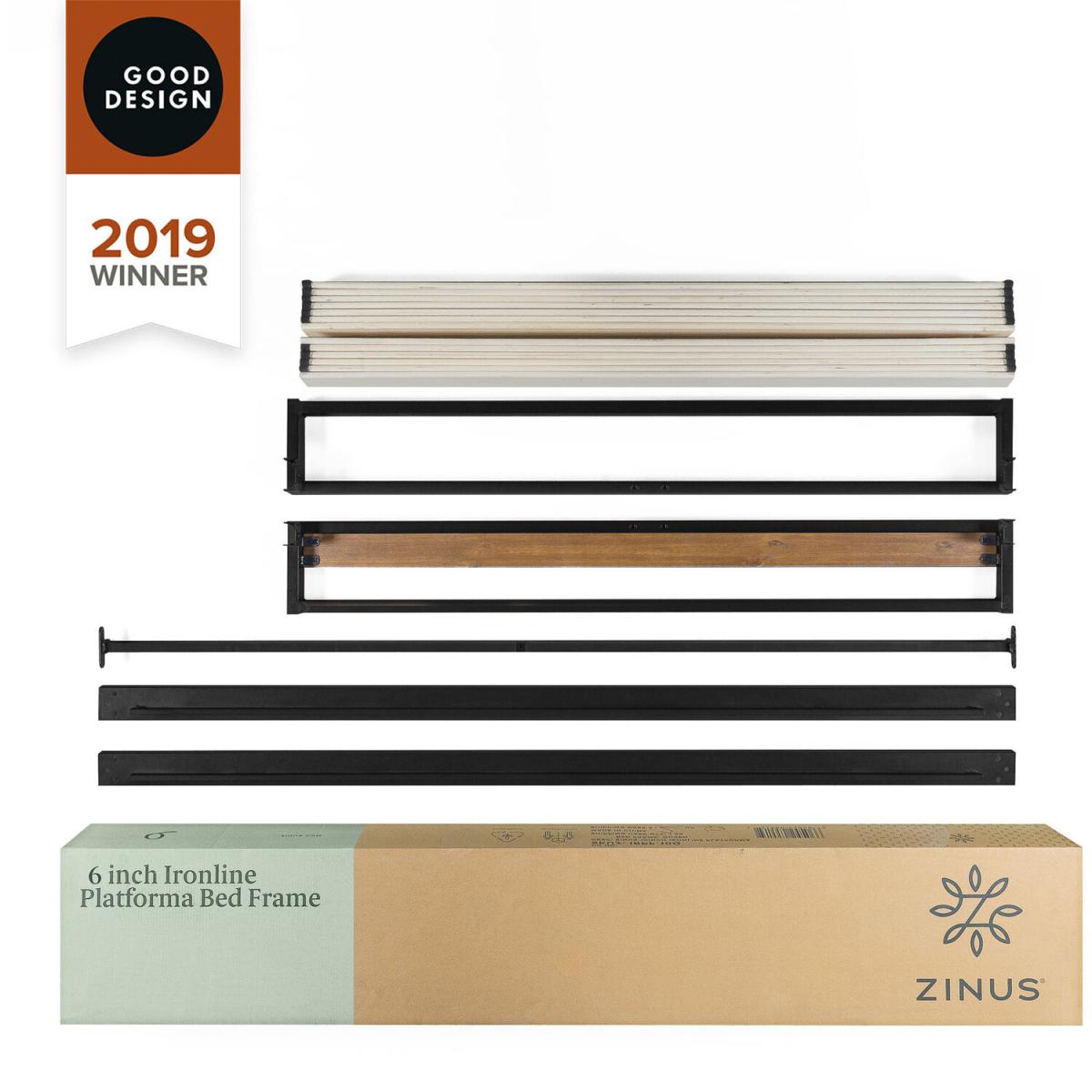 Modern Design Bed Frame. Sleek, sturdy, and designed with a modern-industrial spin, this bed frame takes the hard work out of looking good. Made with a wooden footboard and bold metal structure, this bestseller is surprisingly simple to set-up, and delivered to your door with everything you need for assembly in under an hour. In fact, this 2019 GOOD DESIGN Award Winner has earned recognition for its elevated style, durable structure, box-spring eliminating platform and efficient, all-in-one-box packaging. Strong, beautiful, and award-winning - a sleep scape trifecta. GOOD DESIGN AWARD WINNER - Awarded by the Chicago Athenaeum Museum of Architecture and Design in 2019 for outstanding design and packagingMODER N INDUSTRIAL DESIGN Wooden footboard coupled with a black steel frame offers a sleek, industrial inspired look NOISE FREE - Wooden slats designed to minimize noise when you sleep and designed to extend the life of your mattress EXPERTLY PACKAGED - All parts, tools and instructions are skillfully packed into one box for easy assembly in under an hourWORR Y FREE five-year limited warranty included. Mattress sold separately