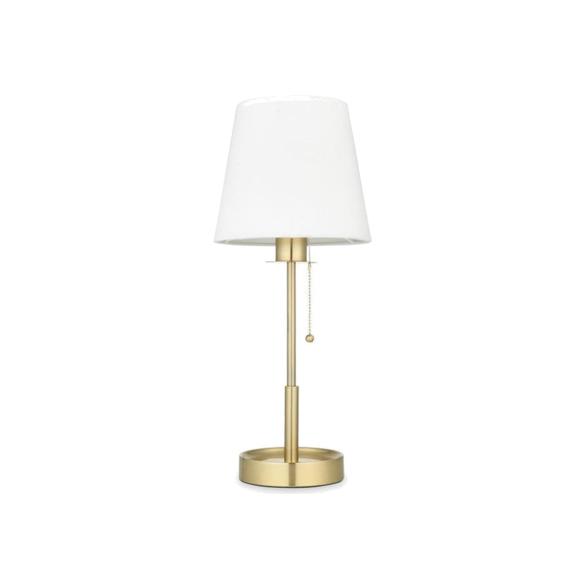 Lila Table Lamp is a perfect blend of vintage charm and modern functionality with brushed brass stem and delicate vintage-inspired chain switch for a hint of art deco decadence. The off-white tapered fabric shade complements any decor with its classic silhouette and an added bonus; the base features a raised edge tray, providing a stylish spot to store your jewellery.