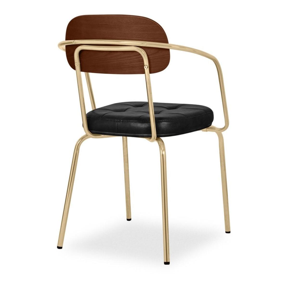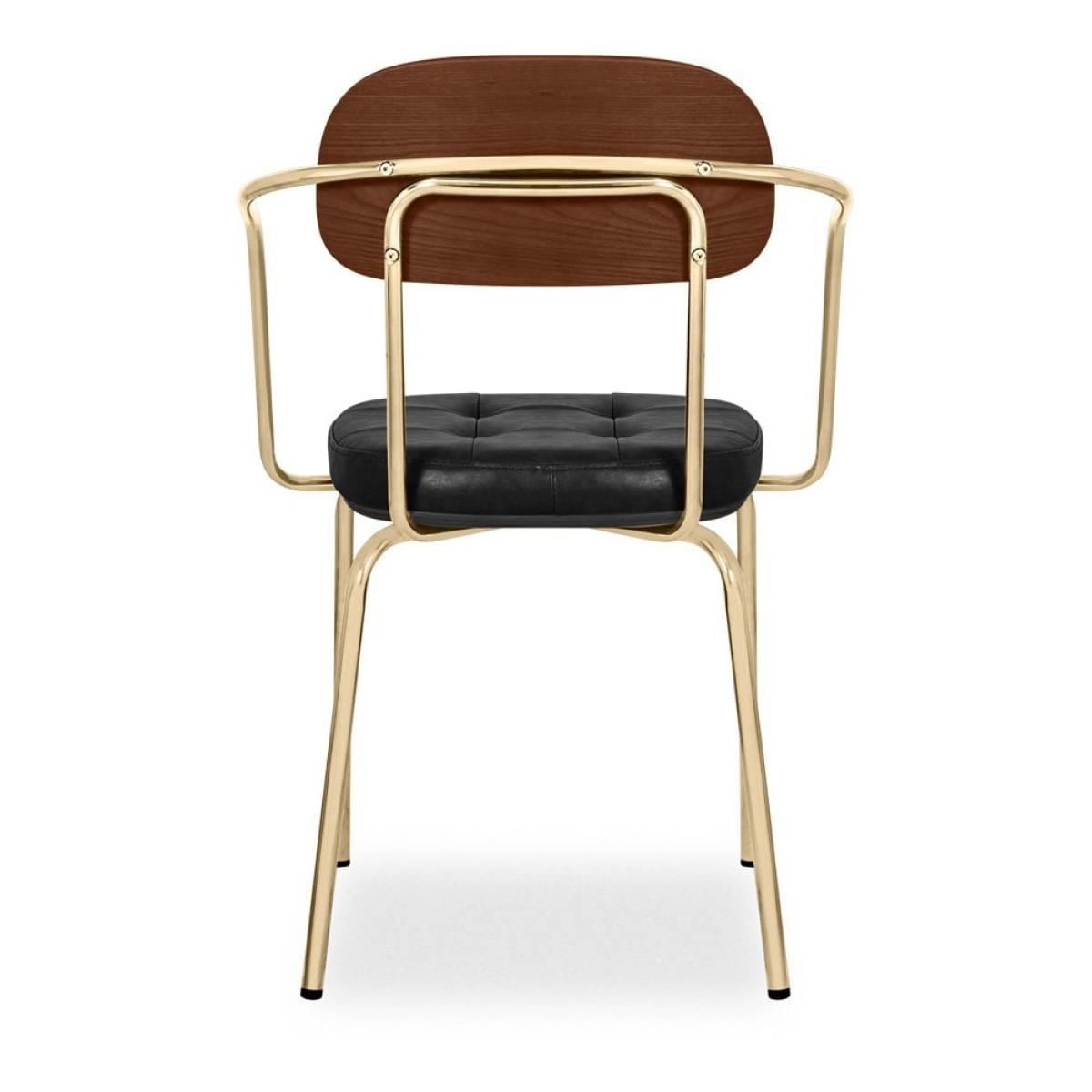 The Maddox Carver Dining Chair with a vintage black seat and brushed brass frame combines comfort with design. This industrial-inspired chair has the practicality and durability for a vibrant dining environment mixed with luxury style. Featuring a wooden backrest, faux leather seat cushion, and metal frame, the Maddox Chair Range uses rich tones and a combination of materials for a comforting retro design.