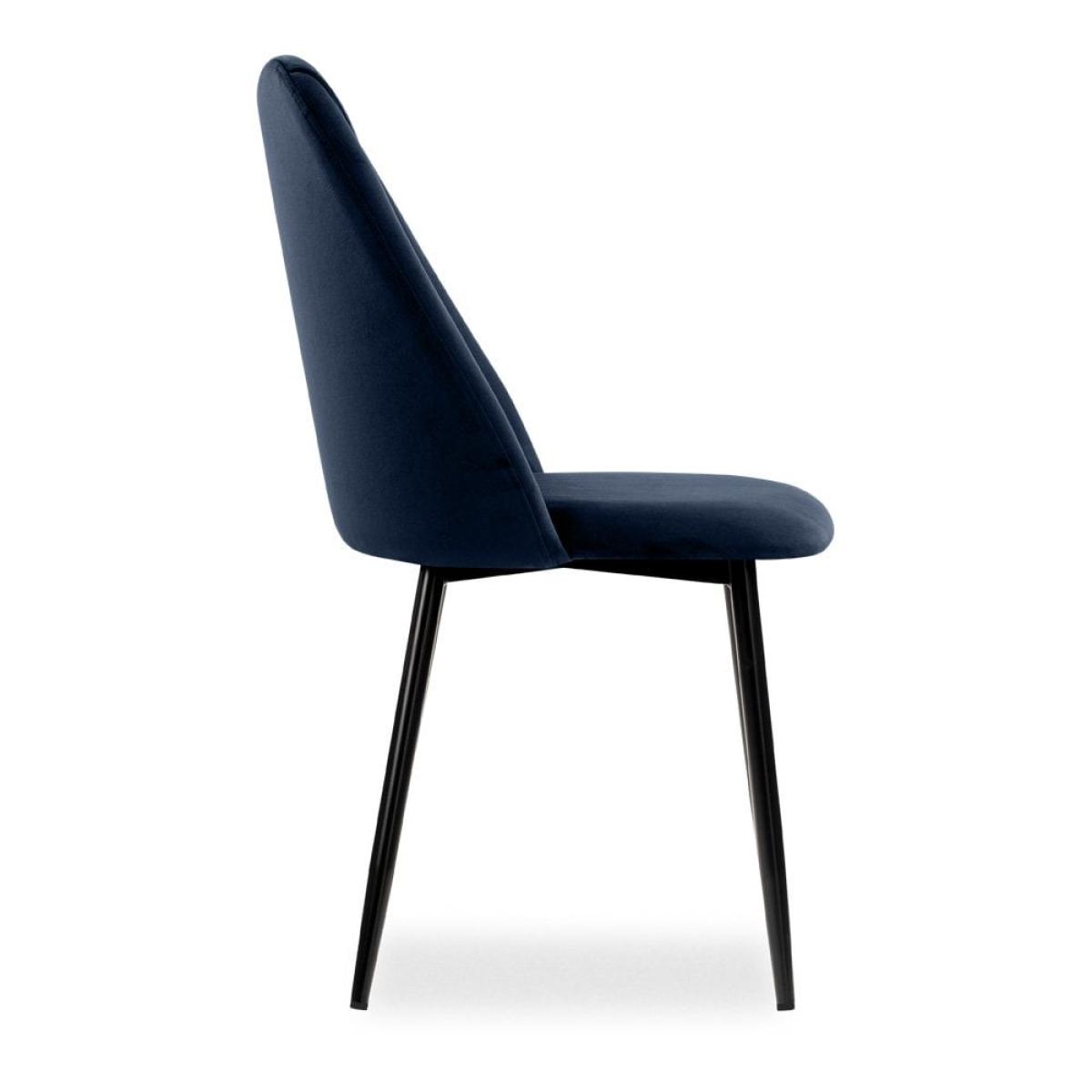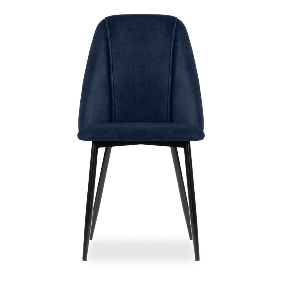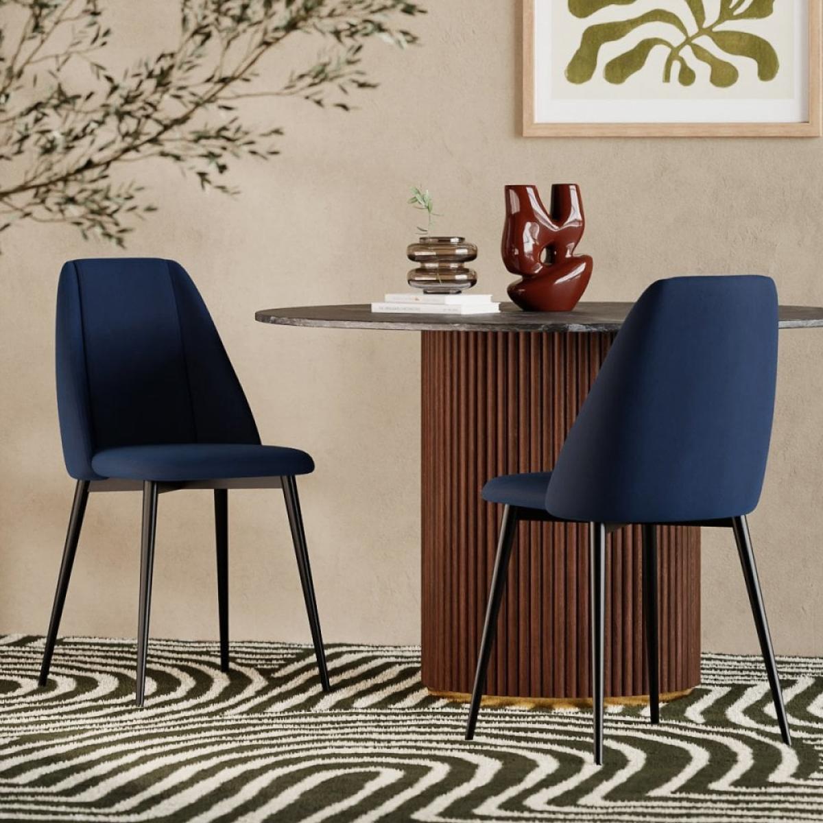 Simple style with a hint of industrialism, the Marco Velvet Dining Chair in royal blue is upholstered in sustainable velvet with stitched vertical detailing and a padded seat. Featuring; angled metal legs in black and curved backrest to keep you sitting comfortably, this classic design is perfect for kitchens and dining areas looking for an understated yet refined style. For a rich depth of colour and unique softness, our velvet used in this chair is not only of the highest quality but it is made from 100% recycled PET yarns so it is kinder to the environment too.