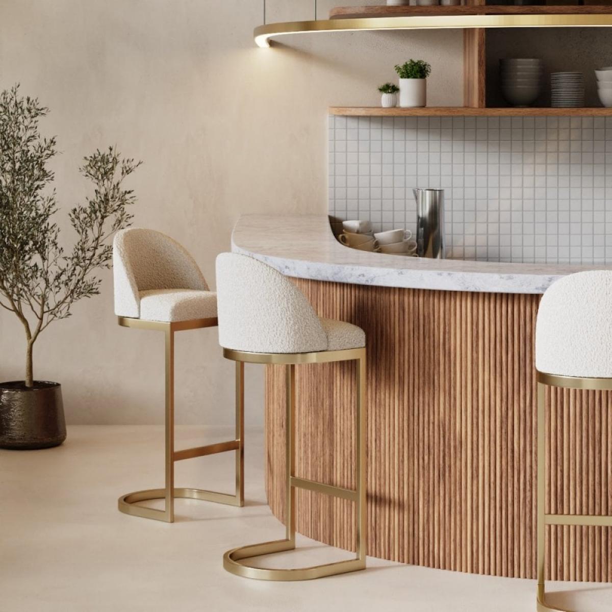 I love this barstool’s clean, contemporary look thanks to its ivory boucle seat paired with the sleek black legs. It's a versatile piece that works well in modern kitchens or minimalist dining areas, adding a touch of texture without overwhelming the space. Practical styling tips include pairing it with a matching boucle or monochrome counter, and accessorising with simple, sculptural tableware to keep the look cohesive. Understated but stylish, it’s perfect for injecting a subtle sense of luxury into a casual setting.