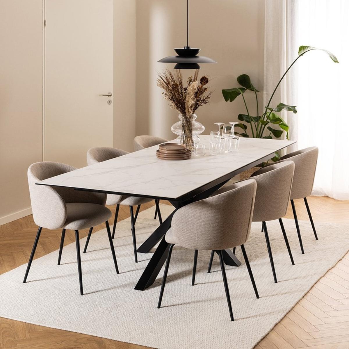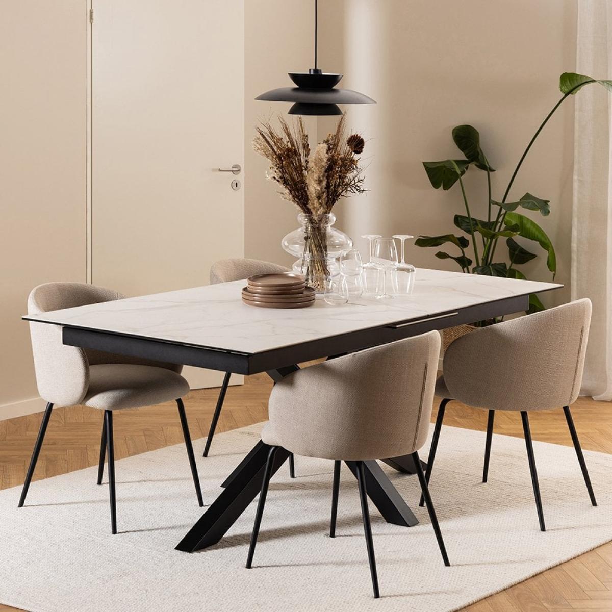 I think this table is a fantastic choice for contemporary interiors that value both style and functionality. Its clean, white ceramic surface lends itself well to modern or minimalist schemes, offering a sleek look that can be easily dressed up or down with accessories. The extendable feature makes it practical for family dinners or entertaining guests, plus the contrasting black base adds visual interest without overwhelming the space. To style it effectively, consider pairing with simple, understated chairs for a streamlined feel, or add colourful or textured placemats and textiles to introduce warmth and personality. It works particularly well in open-plan kitchens or dining rooms with neutral tones, where its modern vibe can really stand out.
