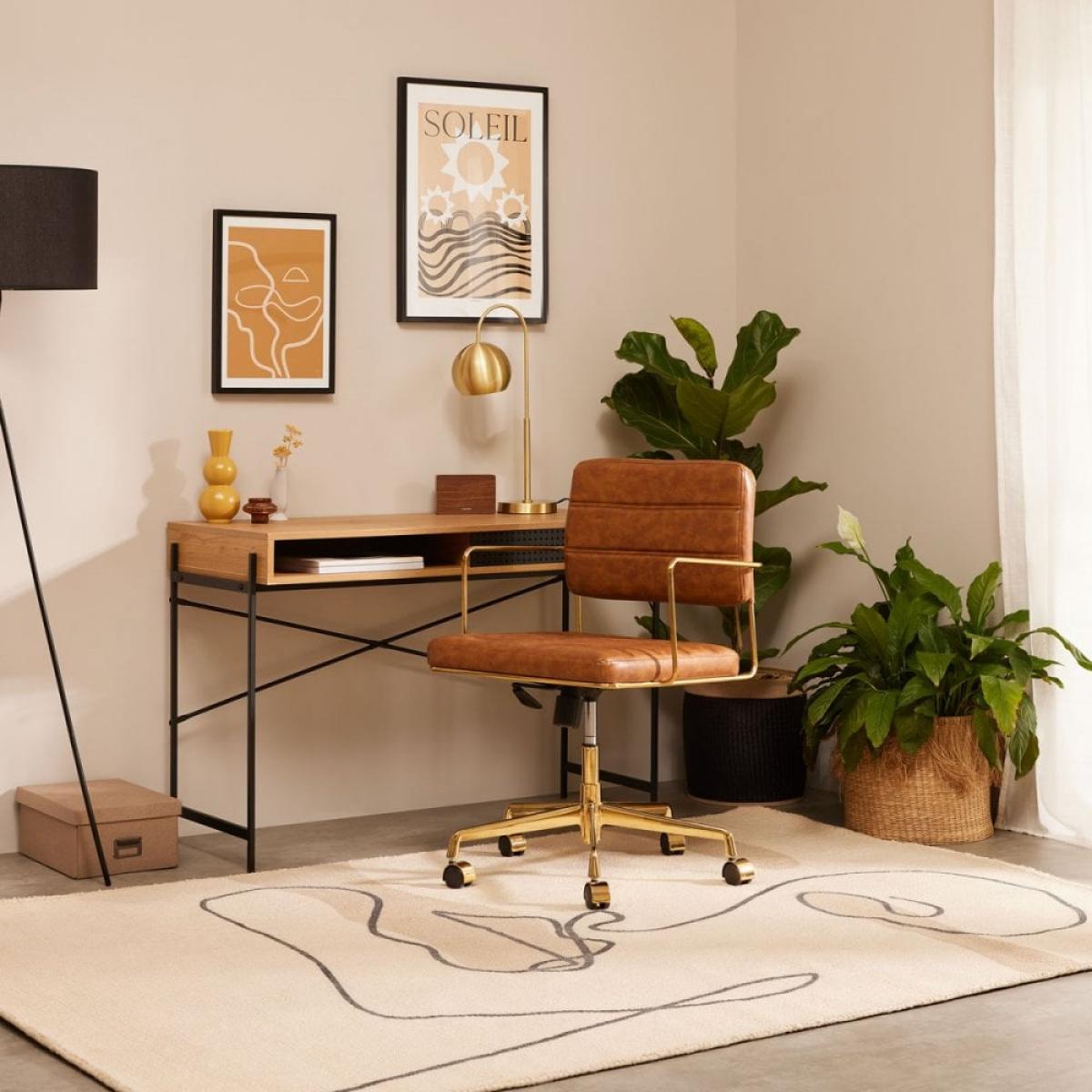 I love this office chair’s vintage tan leather finish-it adds warmth and character to any workspace. It works particularly well in interiors that feature mid-century modern, industrial, or eclectic styles, where its aged, timeless look complements natural wood accents and metal details. To style it effectively, consider pairing it with a sleek, minimalist desk or mixing it with textured accessories like woven rugs or metal shelving to balance its rich leather feel. Practical tips include keeping the leather conditioned to maintain its patina and using colourful or textured cushions to add extra comfort and visual interest. This chair is versatile enough to elevate a home office or a creative studio while offering a stylish, practical seating option.