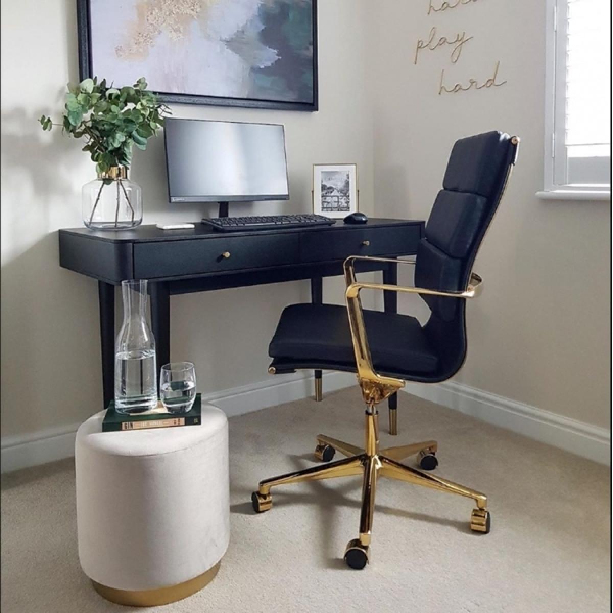 I love this office chair for its sleek, modern look and luxurious touches like the brass accents. It’s a versatile piece that works well in both contemporary and luxe-inspired interiors, thanks to its high-back silhouette and elegant finish. For styling tips, it pairs beautifully with neutral-toned desks and textured textiles, such as a plush rug or soft throw, to soften its office-ready vibe. Practically, it’s ideal for creating a stylish home workspace or a sophisticated office corner - just make sure to keep the brass details clean to maintain its polished appearance. Overall, it’s a chic upgrade that combines comfort with a touch of glamour.