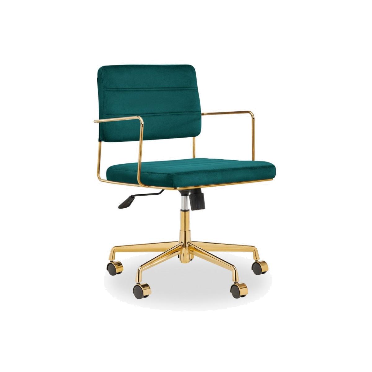 I love this office chair because of its striking teal velvet upholstery combined with the sleek gold accents-it's a real statement piece that adds a touch of glamour to any workspace. It works well in both contemporary and vintage-inspired interiors, especially when paired with neutral tones or dark woods to make the colour pop. For styling tips, consider placing it in a corner with lush plant neighbours or alongside minimalist desks to highlight its luxe vibe. Practicality-wise, the velvet adds softness and comfort, making it perfect for longer work sessions, while the gold detailing gives it an upscale feel that can elevate even a straightforward home office.
