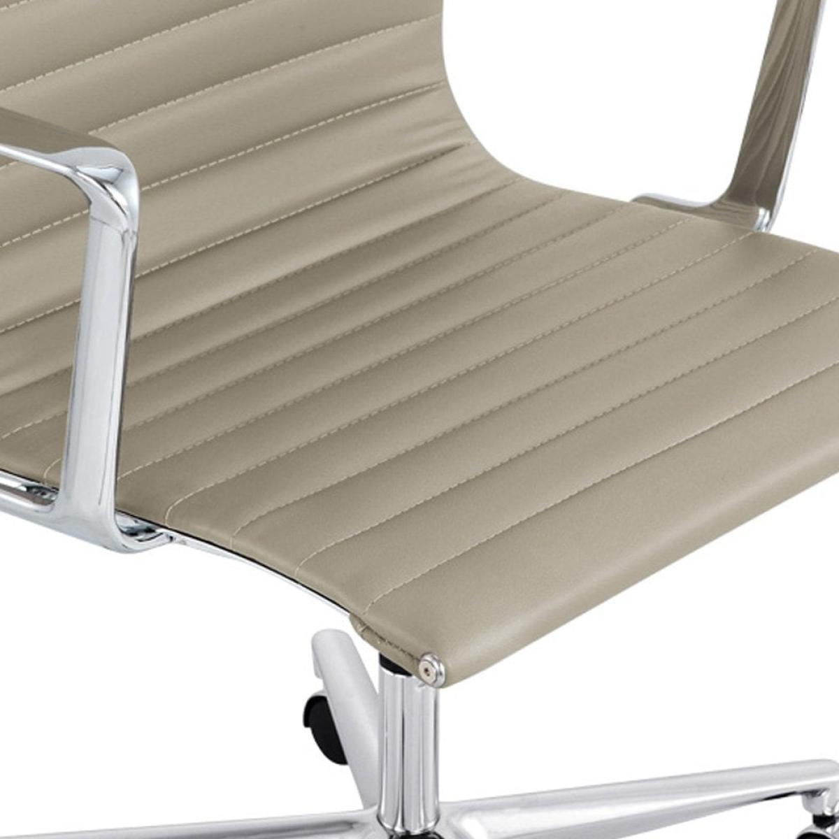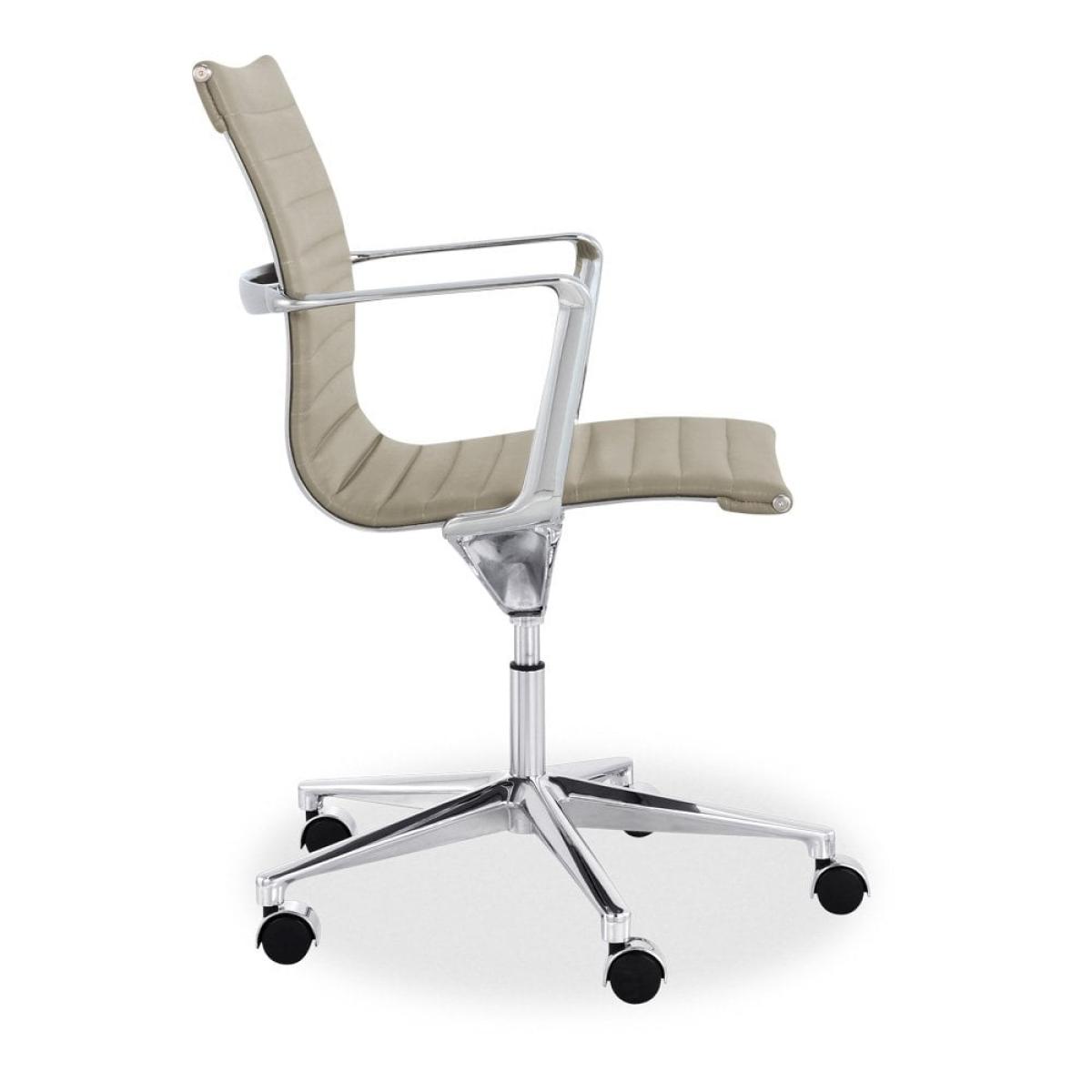 An office chair that is both stylish and comfortable, meet the Ribbed office chair in sage grey faux leather with a low back. Showcasing a height-adjustable seat on a swivel metal base with five rollerball wheels - making this chair ideal for those long working days at home or in the office. Made with our new style U shape bracket, sleek chrome frame and armrests, these elements have clean lines for a minimal look. The backrest is supportive and contoured whilst the seat foam cushioning offers maximum comfort. View The Ribbed Office Chair Range