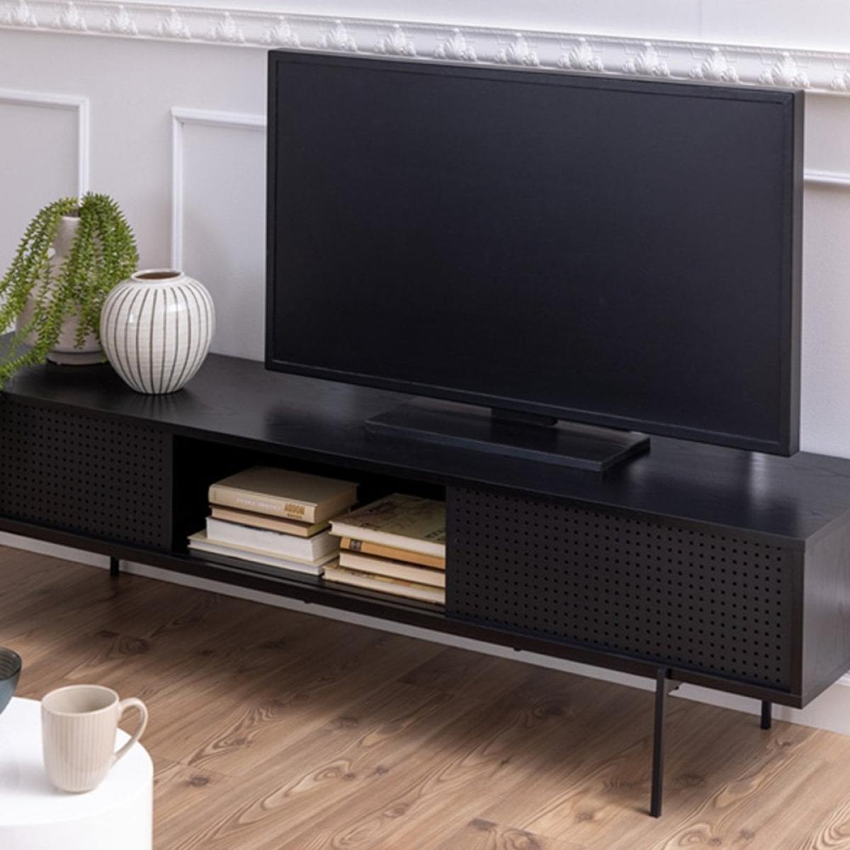 The Angus Large TV Stand in black wood is a sophisticated and stylish addition to any living room. Characterised by clean lines and a light structure, this modern TV stand is sure to upgrade your entertainment area. Notice the mesh sliding doors on either end, keeping clutter out of sight for a clean contemporary living space. They add an industrial element to the unit and offer excellent storage space.
