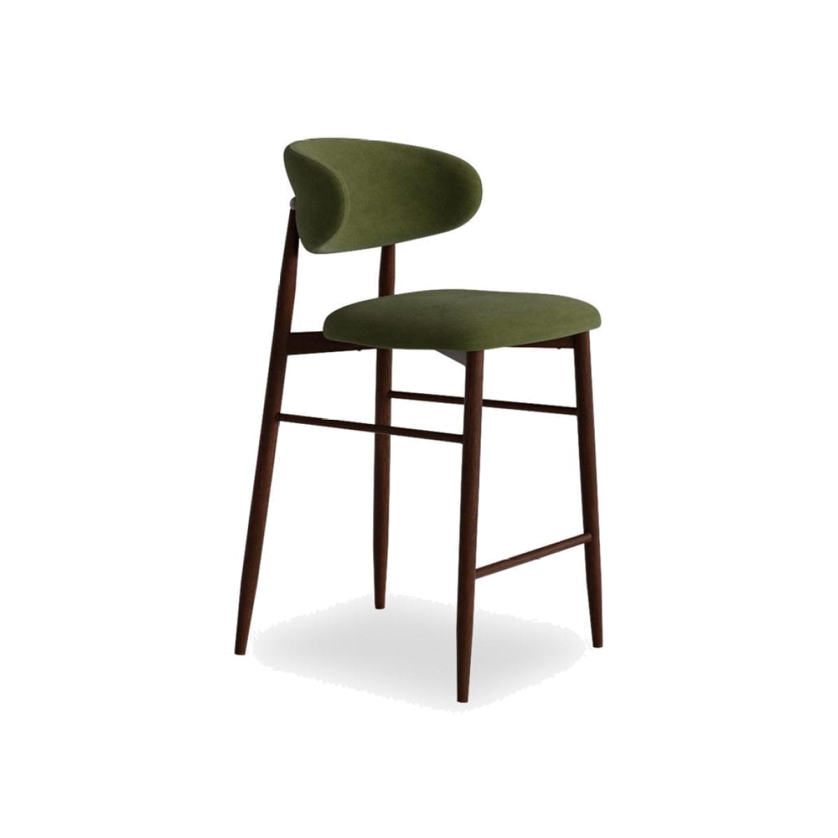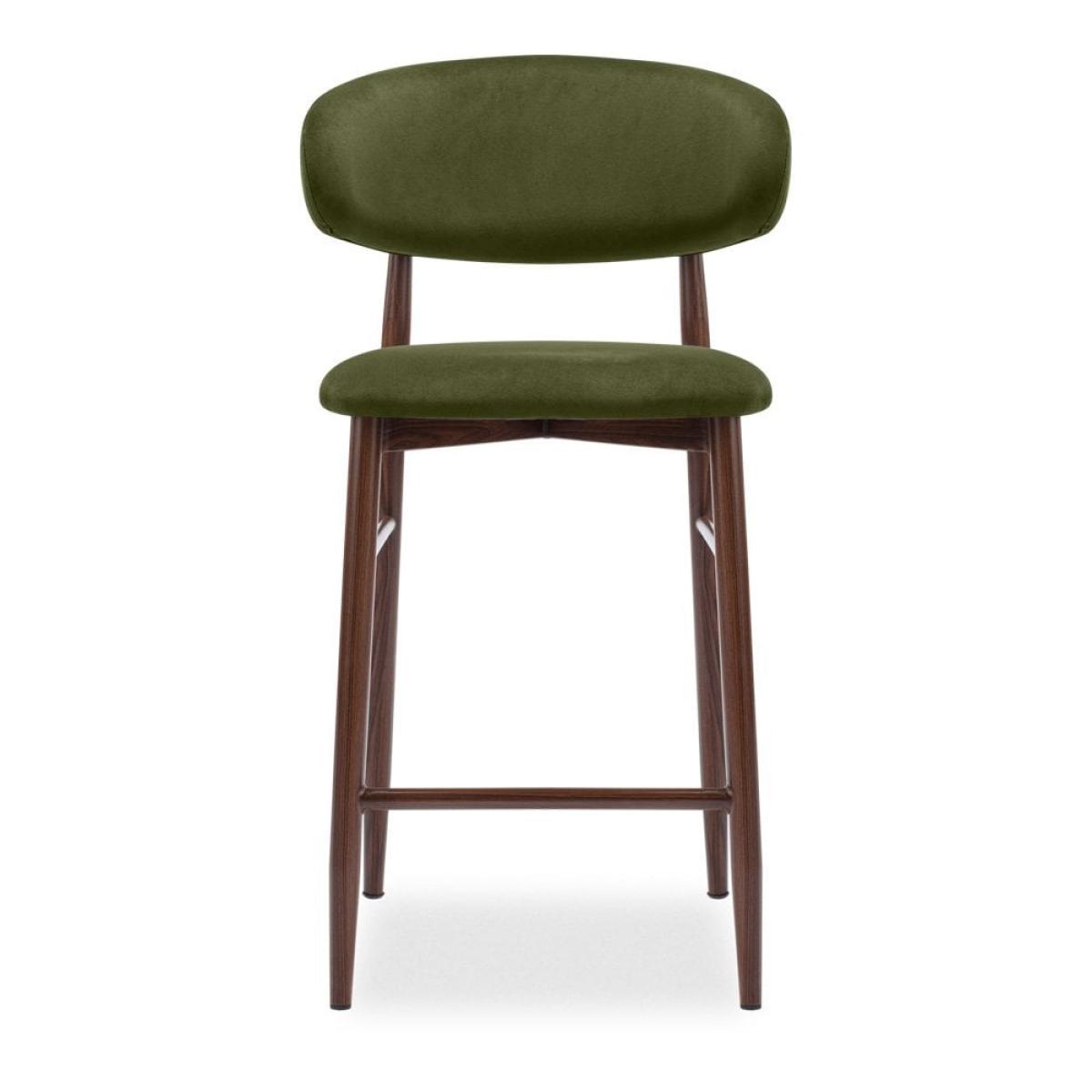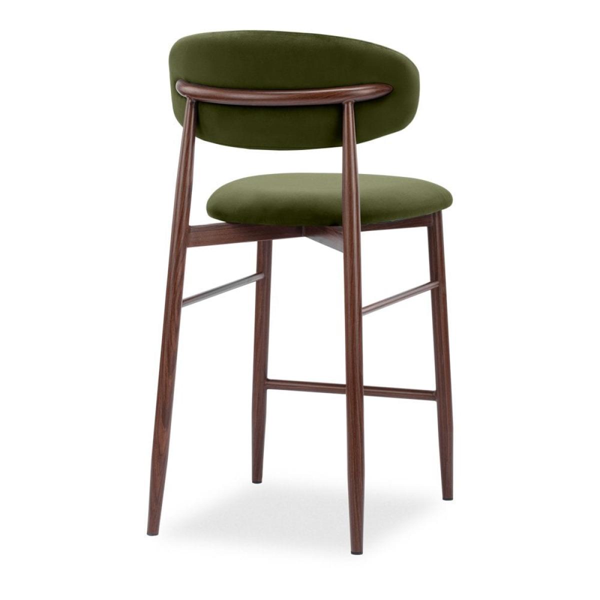 The harmonious blend of Nordic and Mid-Century in the Halston Kitchen Stool makes it an irresistible option for kitchen counters. The curved metal frame has a walnut wood finish and is cross-fixed, making the Halston durable and long-lasting for a high quality finish built to last. Crafted for comfort, the seat is upholstered in sustainably-sourced velvet, soft and textural to the touch, in a olive green hue. For a rich depth of colour and unique softness, our velvet used in this chair is not only of the highest quality but it is made from 100% recycled PET yarns so it is kinder to the environment too. View The Halston Range