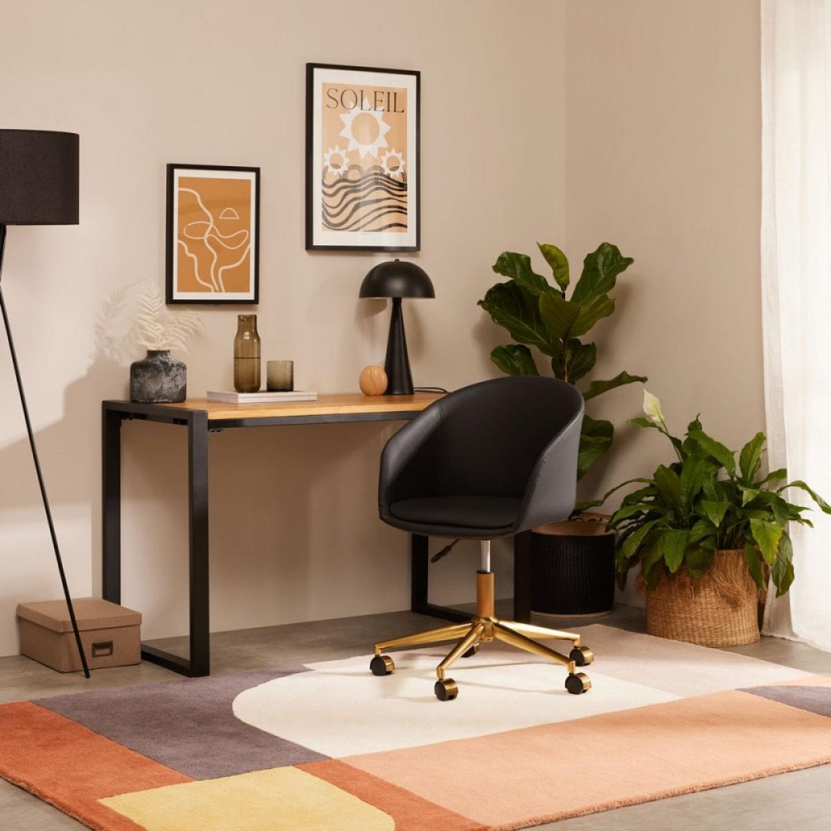 I love this office chair for its sleek, contemporary look and versatile colour scheme. The black seat combined with the brass leg creates a chic, modern aesthetic that works well in both minimalist and eclectic interiors. It’s an excellent choice for a home office or a commercial space aiming for a stylish yet functional vibe. For styling, consider pairing it with a glass or wood-top desk to enhance its sophisticated edge, and add soft textiles like a patterned cushion or a textured throw to make the workspace more inviting. Its neutral palette makes it adaptable, so it can easily fit into colour schemes ranging from monochrome to warm earth tones. Plus, with its swivel and casters, it offers practicality without compromising on design.