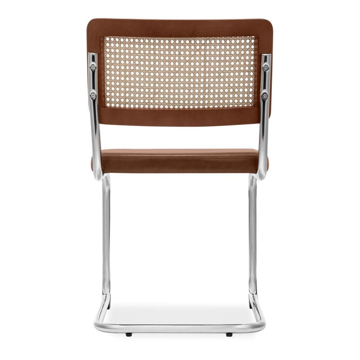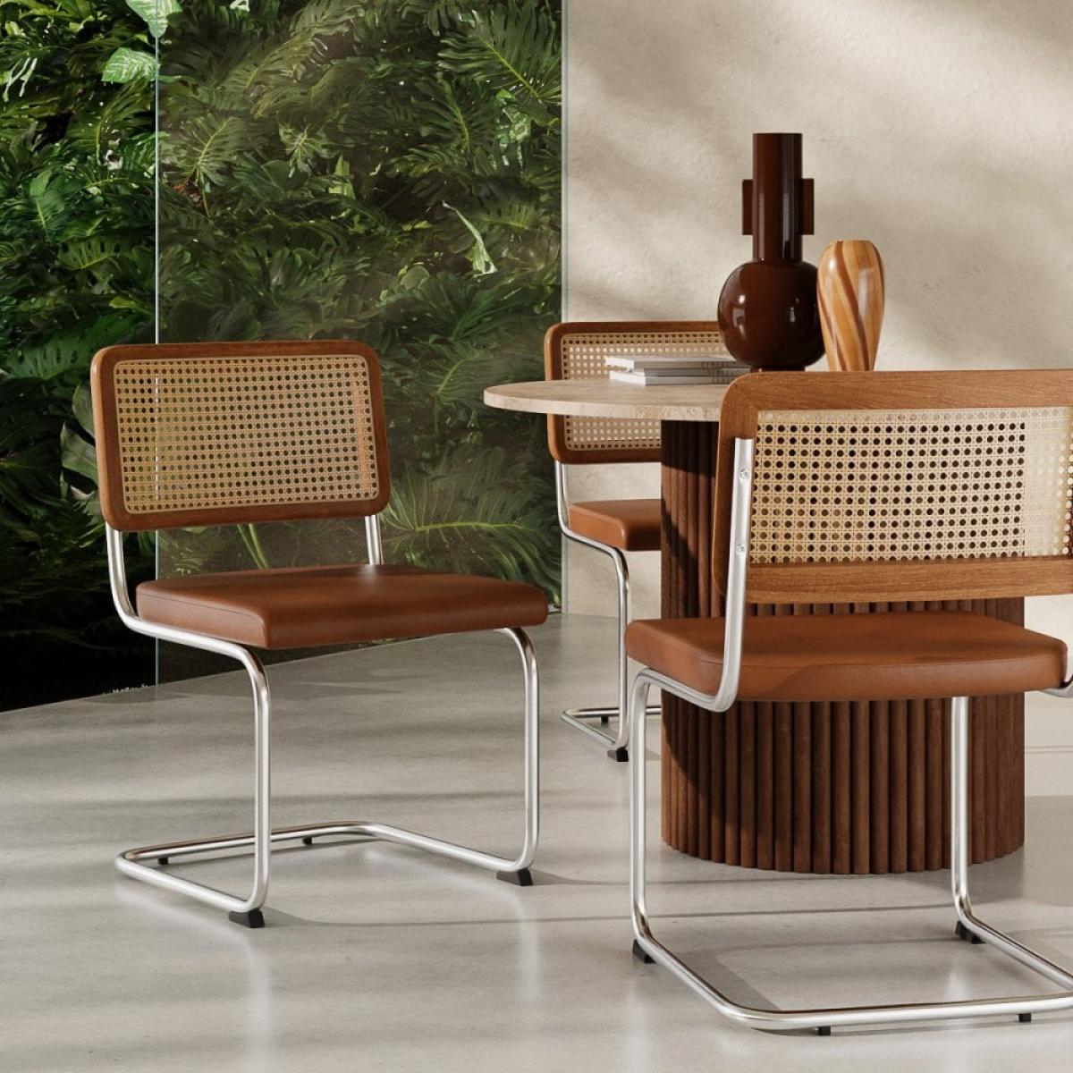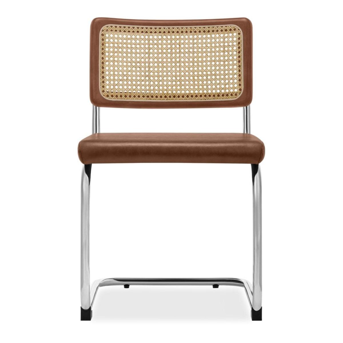 Inspired by Marcel Breuer's Cesca Chair, the Kenton Range is instantly recognisable for its Bauhaus roots including an S-shaped framework and blend of modernist materials. A staple in homes for its beautifully simple design, this Kenton Cantilever Dining Chair features smooth vintage tan faux leather seat and chrome metal frame with a walnut-stained wood and cane backrest. Considered one of the most influential designs of the 20th century, this dining chair has a timeless appeal you've just got to have around your dining table. View The Kenton Range