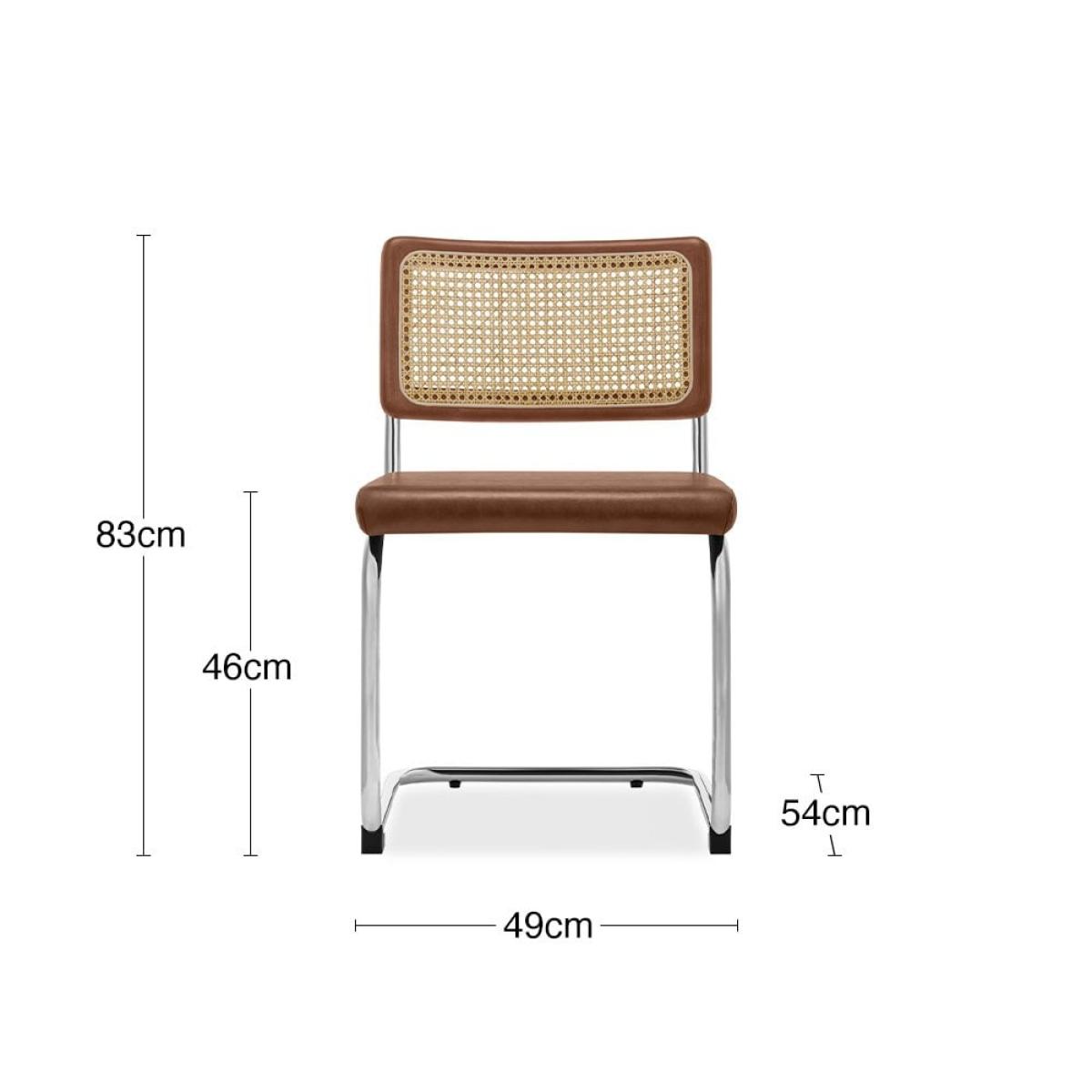 I’m a big fan of this vintage-tan cantilever chair because the rattan back and chrome frame strike a perfect balance between industrial and mid-century modern. The warm leather-effect seat adds texture without overwhelming a scheme, and the open, arched base keeps the look light under a solid wood table. Styling tip: pair it with a dark walnut or ash tabletop and muted linen placemats for a relaxed dining corner, or mix with black metal chairs in a loft-style space to introduce contrast. Keep the chrome gleaming with a soft microfibre cloth, and treat the PU leather occasionally with a gentle leather cleaner to maintain that rich tan tone.