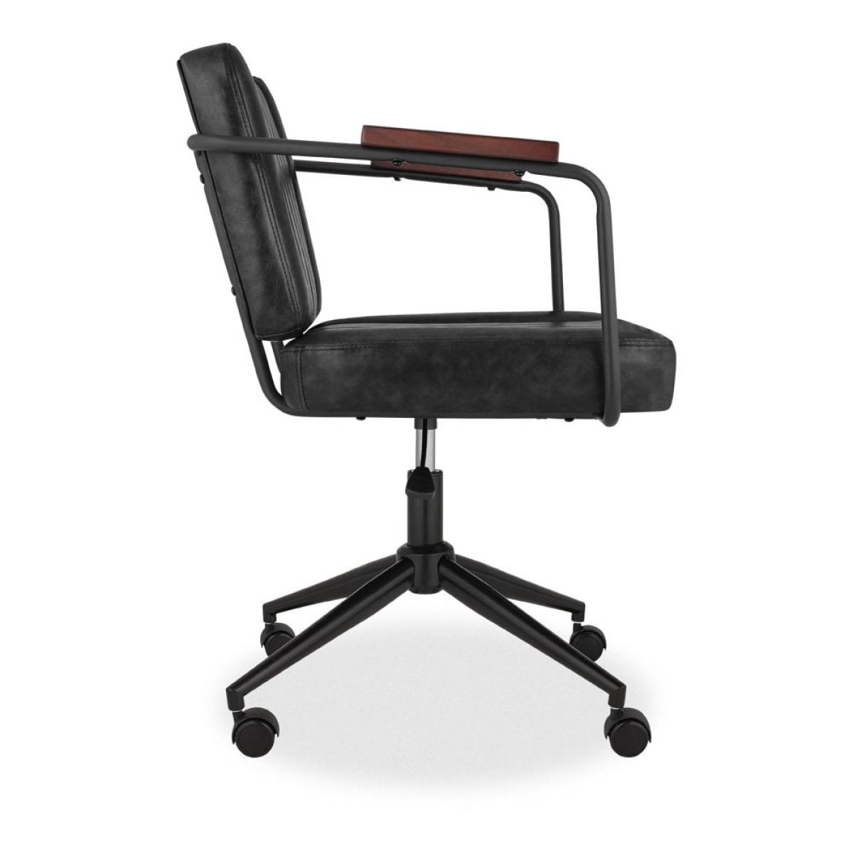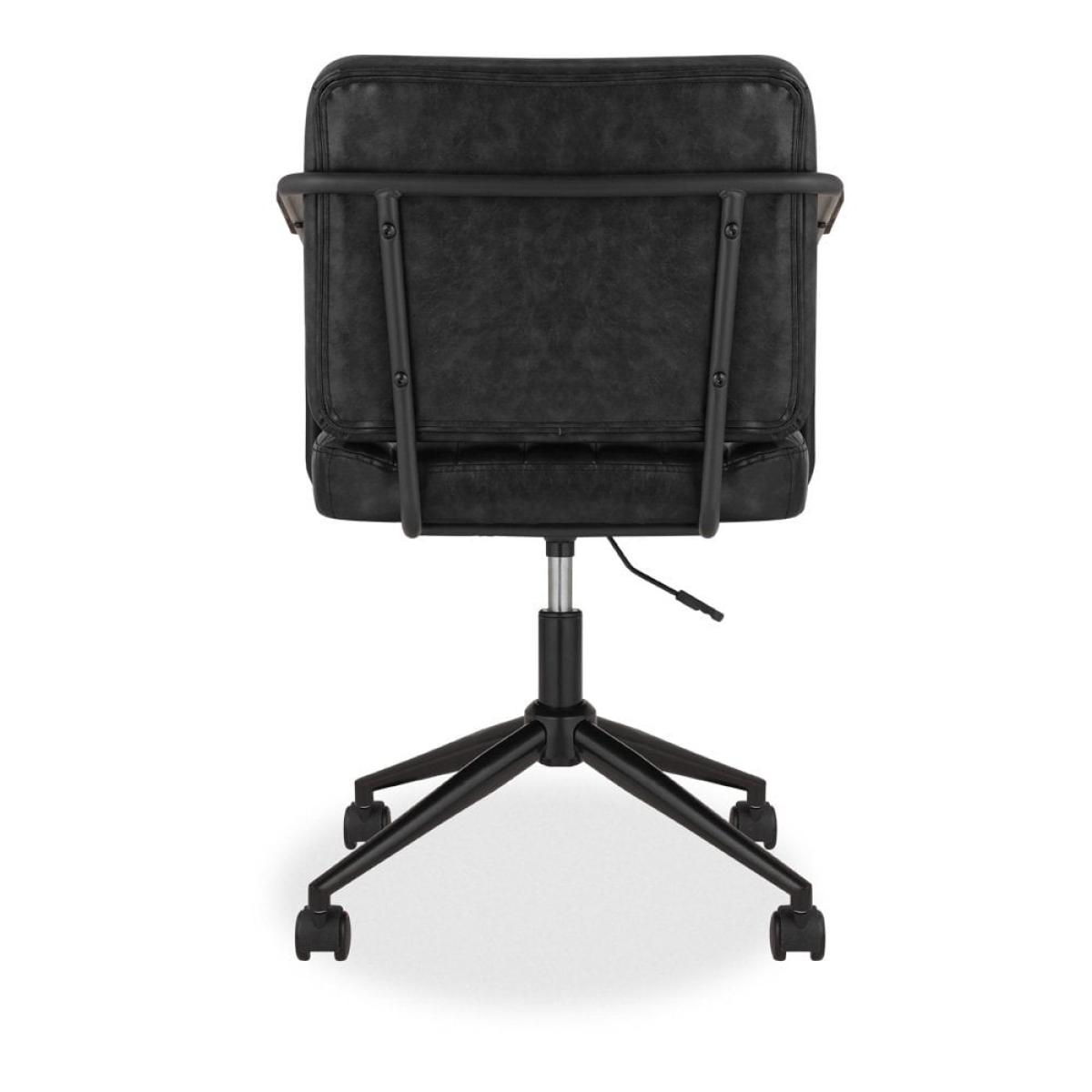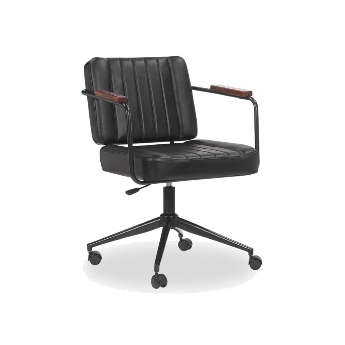 The Mason industrial office chair in vintage tan faux leather is an industrial seat for your home office. The timeless worn quality of the vintage black faux leather upholstery makes each chair unique, and the padded seat offers ultimate comfort during working hours. This chair is complete with a matte black metal frame, adjustable height settings, comfortable armrests, and wheeled legs. Highlighted with wooden armrests that give it a vintage feel.