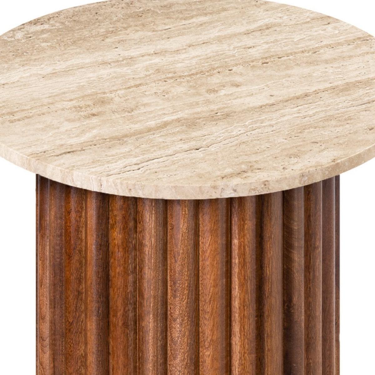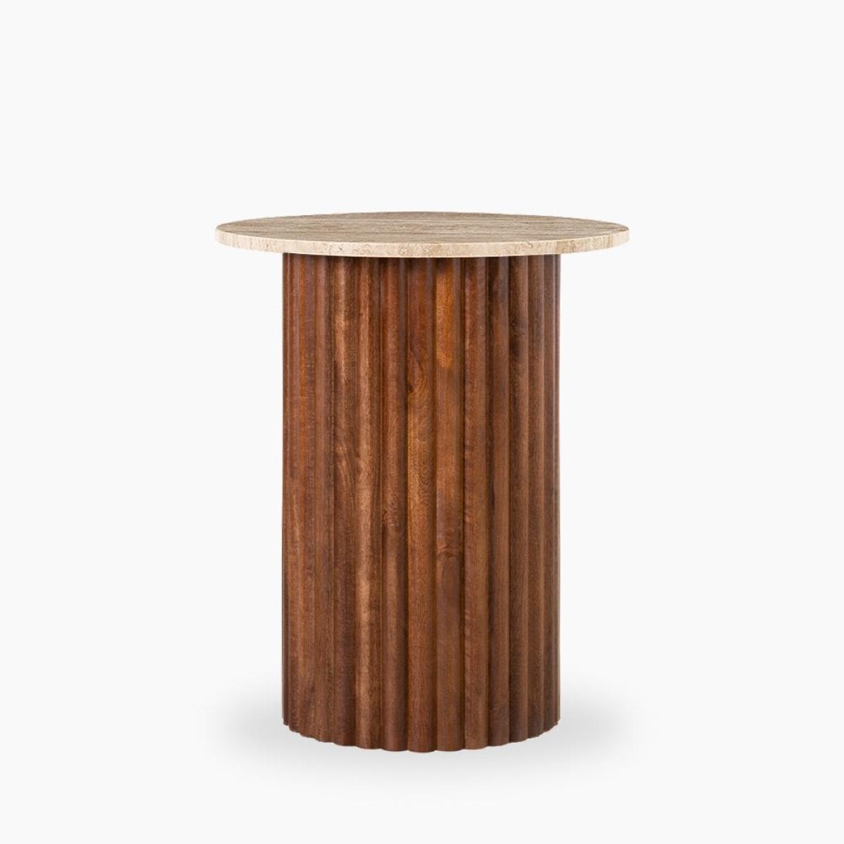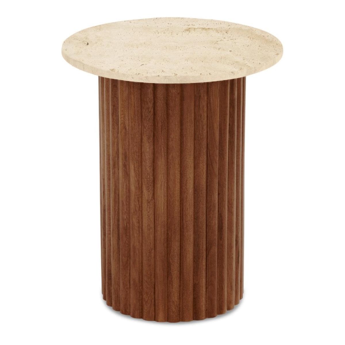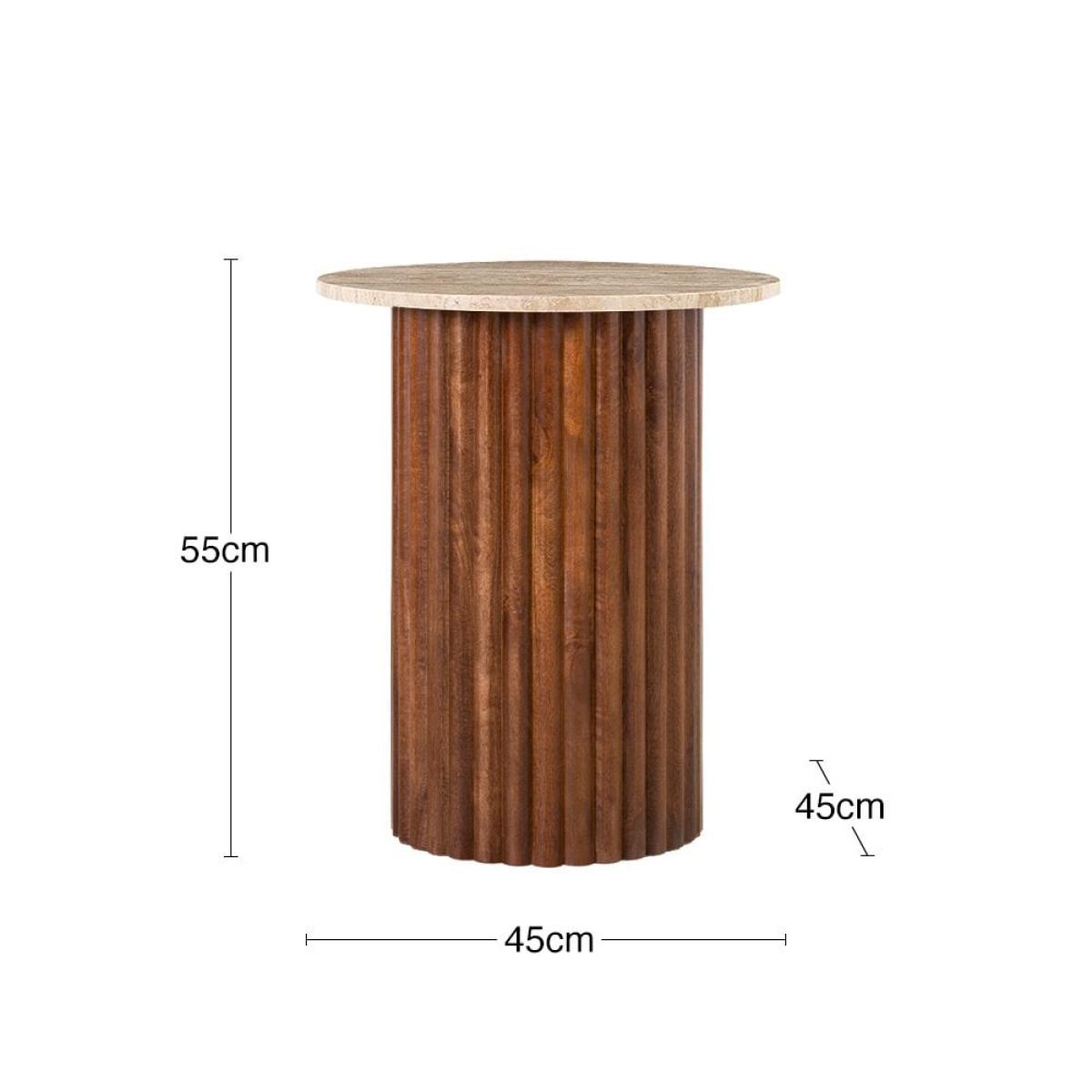 Transform your living space with the Medby Side Table in luxurious travertine and mango wood. Showcasing a walnut-stained base with a ribbed design and a stylish travertine stone top to create a calming living room vibe with this luxe design. Made from 100% natural stone with soft neutral shades, each piece of travertine stone is unique and highly durable. We love the modern style of the base combined with natural stone for a touch of contemporary design to your home. View The Medby Range This product is handcrafted from natural European stone, making each piece unique with naturally occurring texture, pattern, and colour. These variations include small concaves within the travertine surface, and should be seen as part of the beauty of the design that makes this a truly one-of-a-kind piece.