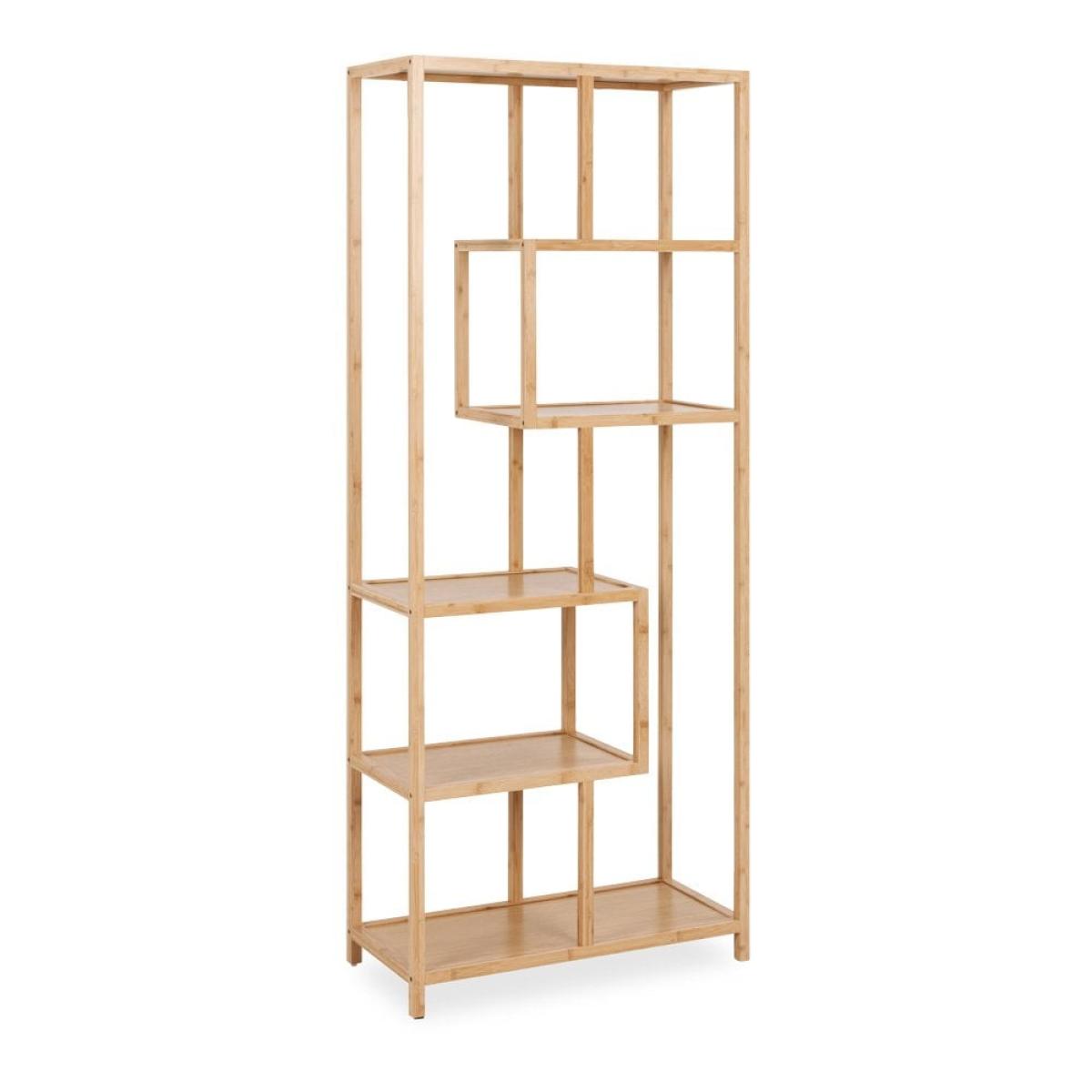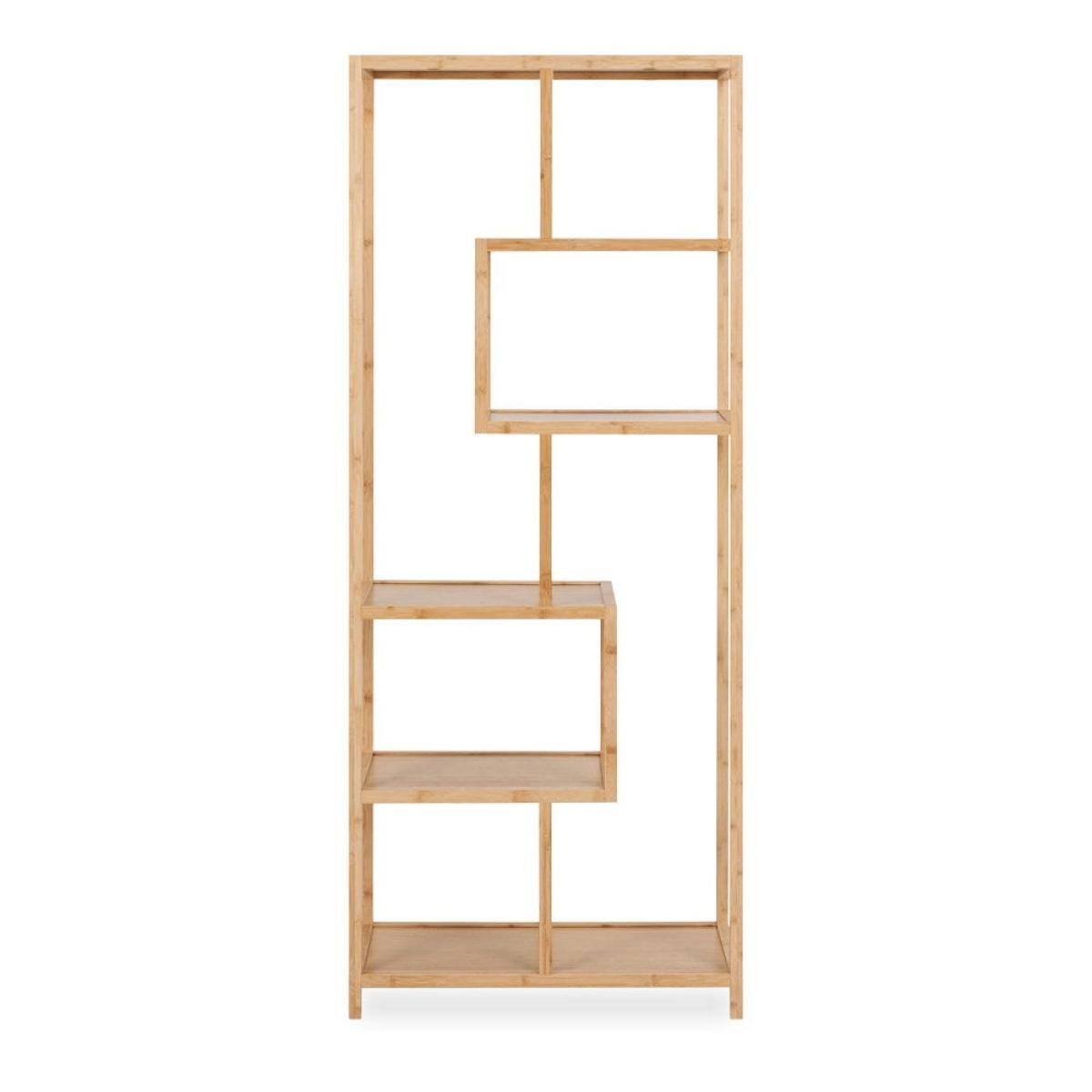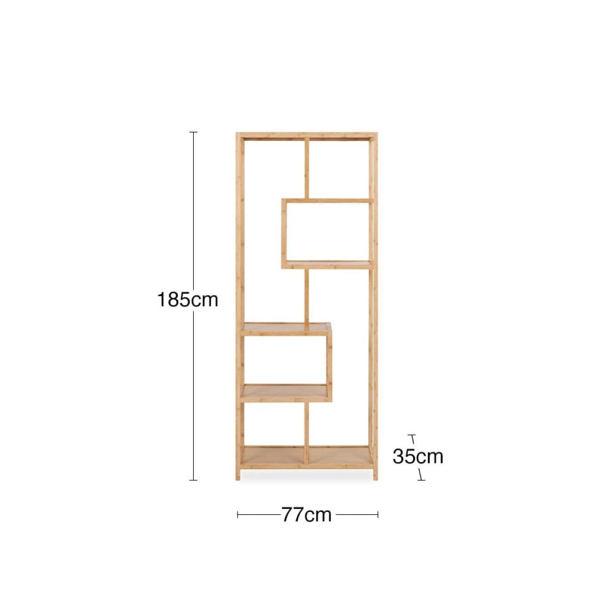 I love how this bamboo bookcase brings a light, natural feel without overwhelming a space - its open, asymmetric shelving suits both minimalist and eclectic interiors. It works well in living rooms, home offices or even hallways, providing display space without a boxed-in look. For styling, mix upright and stacked books, pop in a small plant or two, and introduce a framed print or a decorative object in alternating cubbies. Keep some sections empty to maintain an airy, organised vibe.