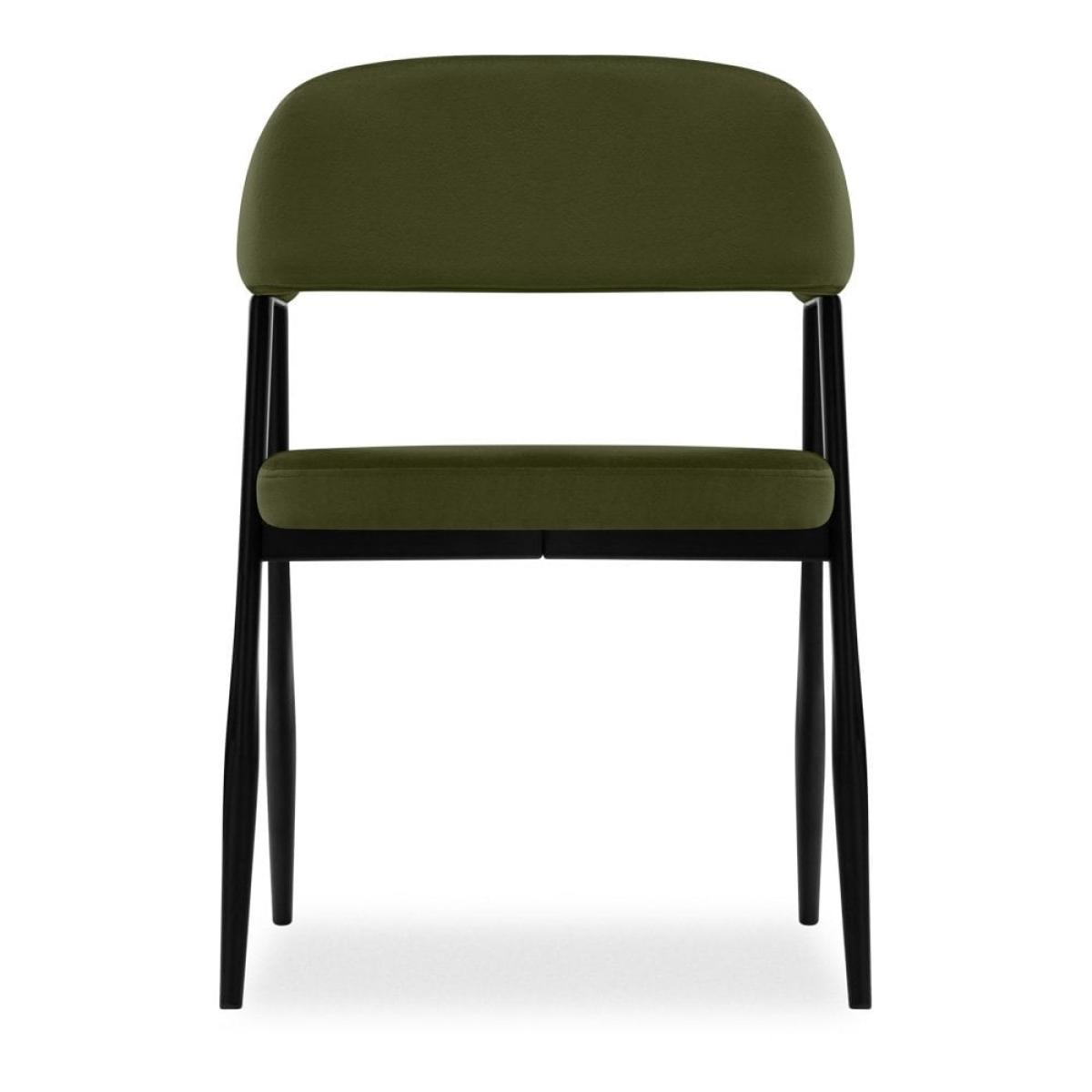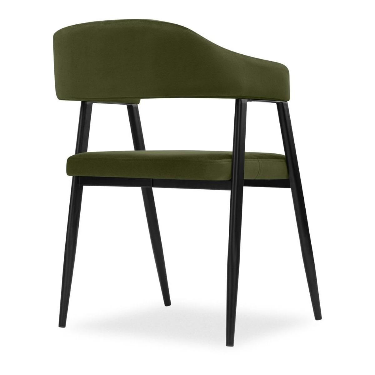 An industrial dining chair made from sustainable velvet and metal, the Presley displays strong structural design and comfort, all in one. Upholstered in olive green with a padded backrest and seat, and durable black metal legs, angled for further stability. This is style and functionality for your modern dining space. View The Presley Range