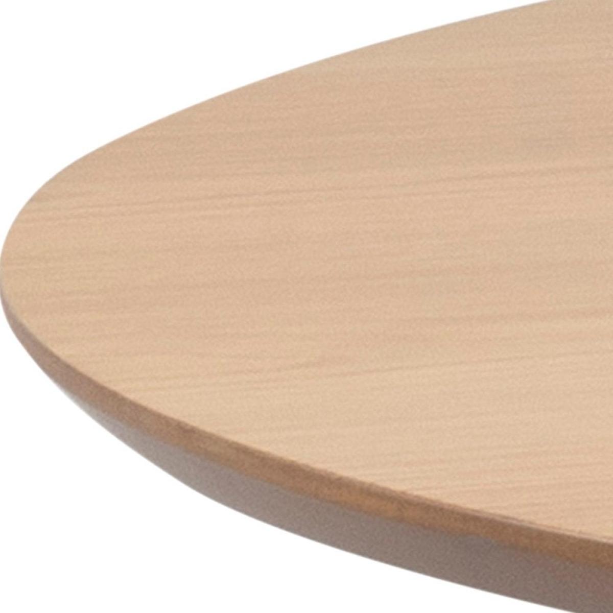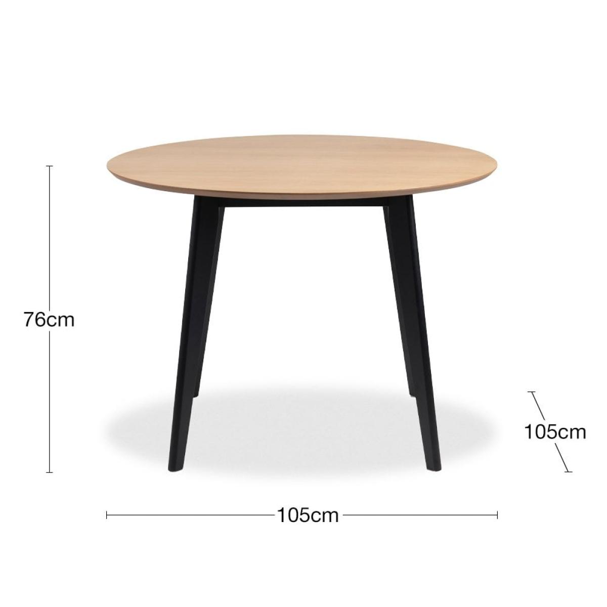 This retro-inspired Roxby Round Wood Dining Table has hints of mid-century design in its silhouette to give a vintage 70's feel to your dining room or kitchen. Featuring an oak veneer table top with an angled black wood frame, the Roxby is a contemporary and convenient choice; perfect for modern open-plan living kitchen/living areas. View The Roxby Range Please Note: this table has an MDF underside edge allowing us to create a more slim-lined flying top effect. From a general view, this will not be noticed.