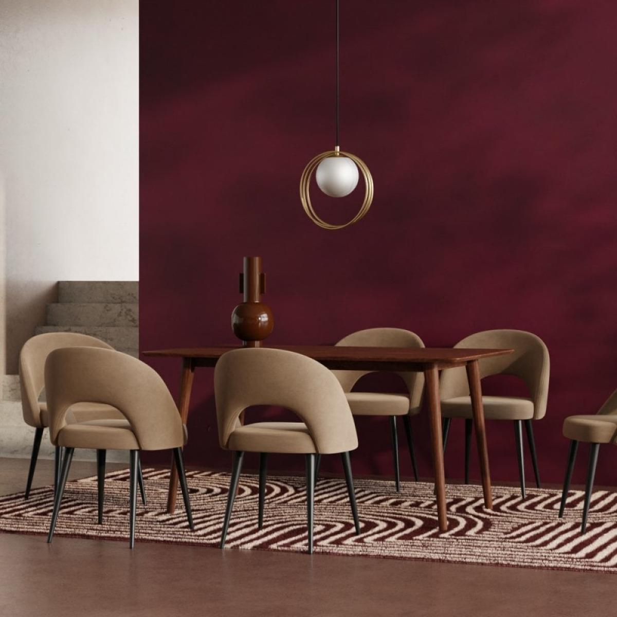 Warm and nostalgic, Retro Revival blends rich earthy hues and functionality seamlessly. With our Milton and Lucille Dining Set, we have curated this iconic look reminiscent of timeless 1960s style. Including 6 Lucille Dining Chairs in taupe velvet and the Milton Dining Table in a rich walnut-stained finish, create your new contemporary dining space with ease. Our dining sets are designed in-house by our Cult Team, combining key interior trends at great value, just for you. For a rich depth of colour and unique softness, our velvet used in this product is not only of the highest quality but it is made from 100% recycled PET yarns so it is kinder to the environment too.