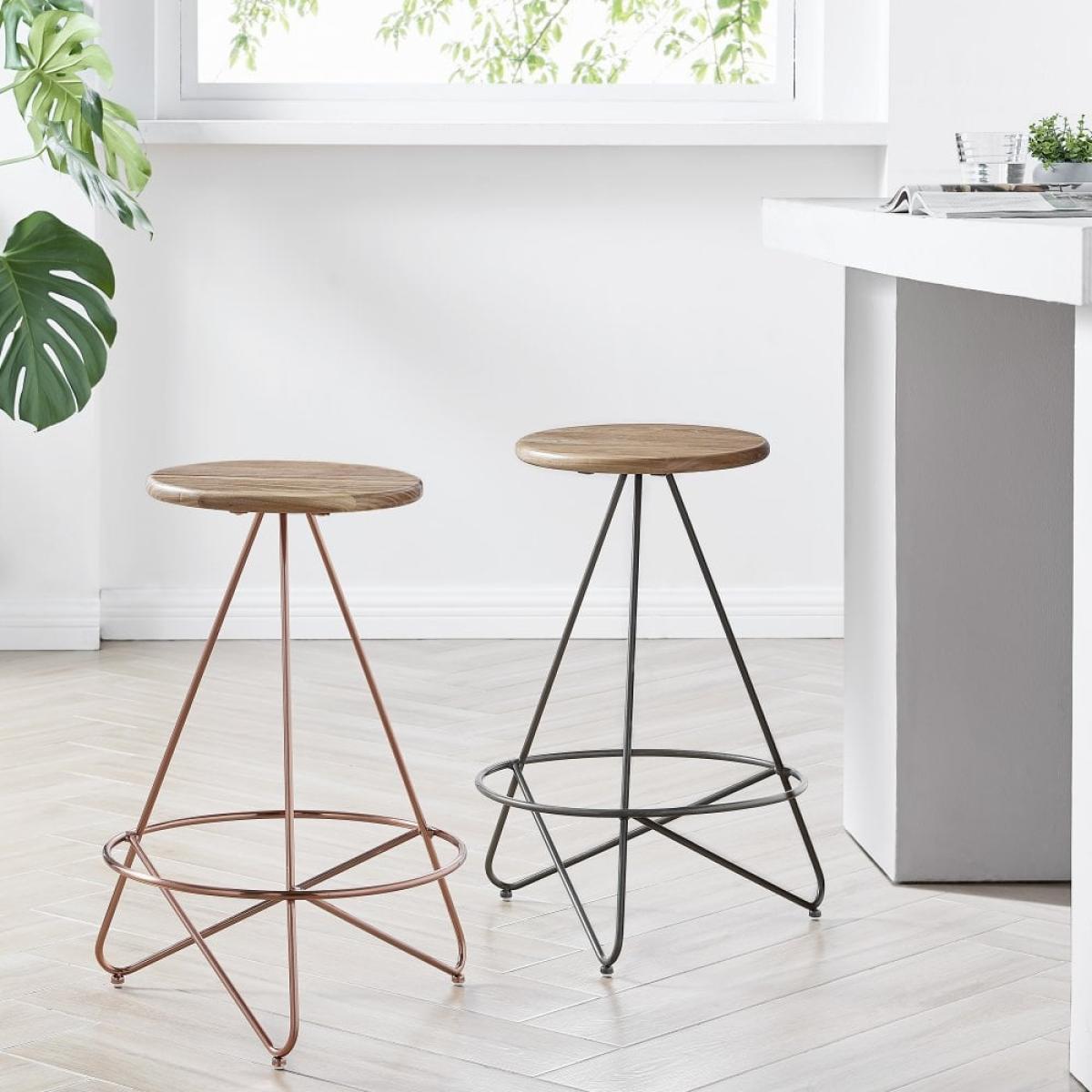 Upgrade your kitchen island with our Finchley kitchen stool. Featuring; natural wooden seats and a sleek yet abstract gunmetal metal base, with a built-in footrest - adding an eye-catching element to any contemporary dining area without compromising comfort. Available in a range of metal finishes, our Finchley stool creates a striking breakfast bar space.