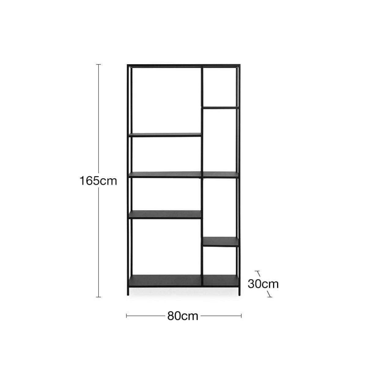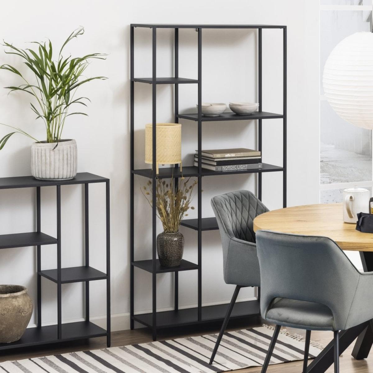 This black bookcase offers a sleek, modern look that works particularly well in contemporary and minimalist interiors. I love its versatile design-it’s practical for organising books, decorative objects, or plants while adding a touch of style. To make the most of it, consider layer­ing books with varied heights and colours for visual interest, or add some small storage boxes to keep clutter hidden. It also pairs nicely with bright or neutral wall colours, helping it stand out without overpowering the space. Overall, it’s a practical yet stylish piece that can adapt to different rooms, from living areas to home offices.
