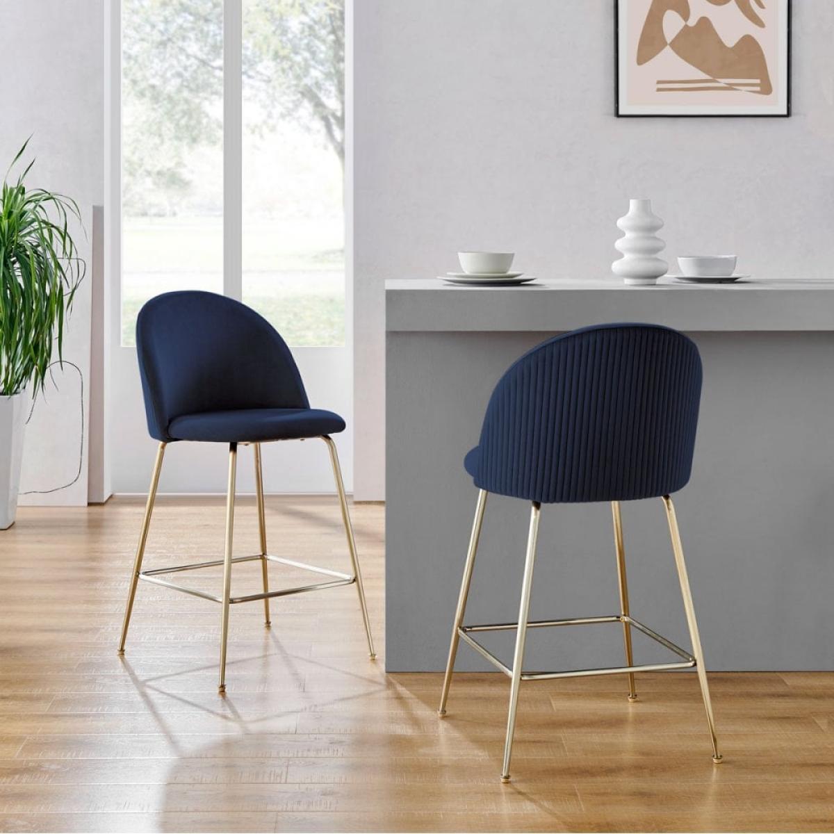 Add a luxe touch to your kitchen island with the Nova kitchen stool. This modern design showcases a curved backrest, upholstered in soft royal blue sustainable velvet, teamed with sleek metal legs and a footrest that offer simplicity and comfort to your space. Note the vertical ribbed stitched design across the back for the ultimate contemporary vibe. For a rich depth of colour and unique softness, our velvet used in this product is not only of the highest quality but it is made from 100% recycled PET yarns so it is kinder to the environment too. View The Nova Range