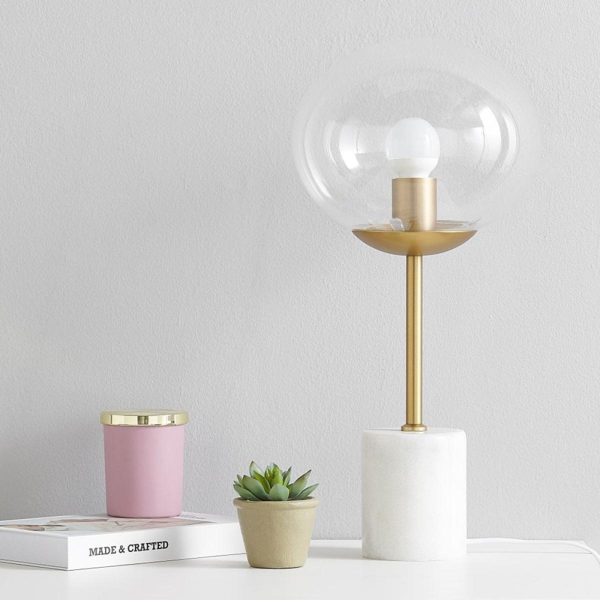 Give your home a touch of vintage style with the Quinn table lamp. The antique metal finish and white marble base is completed with the clear glass shade. The Quinn table lamp has an elegant twist that'll look great in your living rooms and bedrooms. Available in white and black marble.
