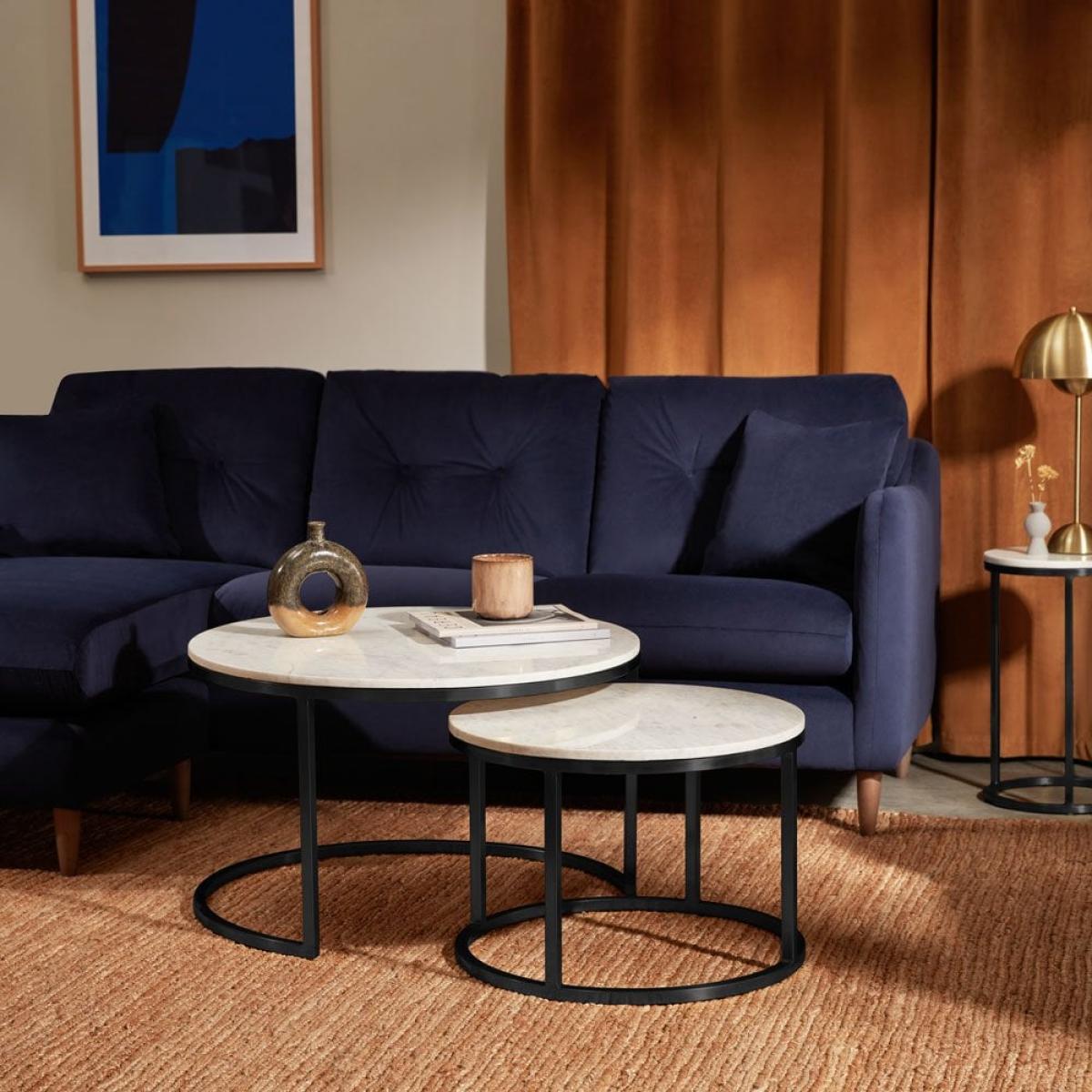 The Madison nesting coffee tables are a must for the home when you need space-saving solutions with a Art Deco twist. In black metal with a white marble top - the Madison is compact and easy to move around any space within your home. View The Madison Range This product is handcrafted from natural marble from the mountains of Rajasthan, India, making each piece unique with naturally occurring texture, pattern, and colour. These variations should not be seen as flaws but a design that is truly one-of-a-kind.
