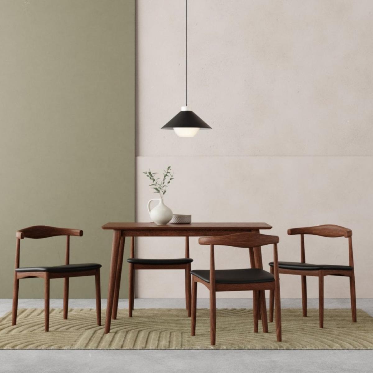 This set offers a sleek and contemporary look with its walnut finish and black seats, making it versatile enough to complement both modern and mid-century interiors. I love how the warm wood tones bring a cosy vibe to dining spaces, while the black details add a touch of sophistication. It works well in open-plan kitchens, casual dining rooms, or even minimalist spaces where clean lines are key. For styling tips, consider pairing it with neutral or textured tableware to let the chairs stand out, and add statement lighting or greenery to create a welcoming ambiance. The set's practical style makes it easy to dress up or down, depending on your interior mood.