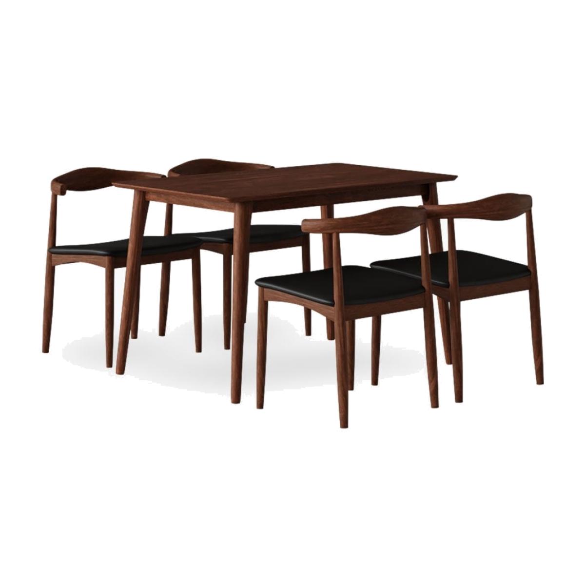 Warm and nostalgic, Retro Revival blends rich earthy hues and functionality seamlessly. With our Milton and Aalborg Dining Set, we have curated this iconic look reminiscent of timeless 1960s style. Including 4 Aalborg Dining Chairs in walnut-stained wood and a black faux leather seat combined with the Milton Dining Table in a rich walnut-stained finish, create your new contemporary dining space with ease. Our dining sets are designed in-house by our Cult Team, combining key interior trends at great value, just for you. Please Note: Wooden furniture will vary in grain pattern, texture, and colour. These natural qualities of the wood used make this material unique and beautiful.