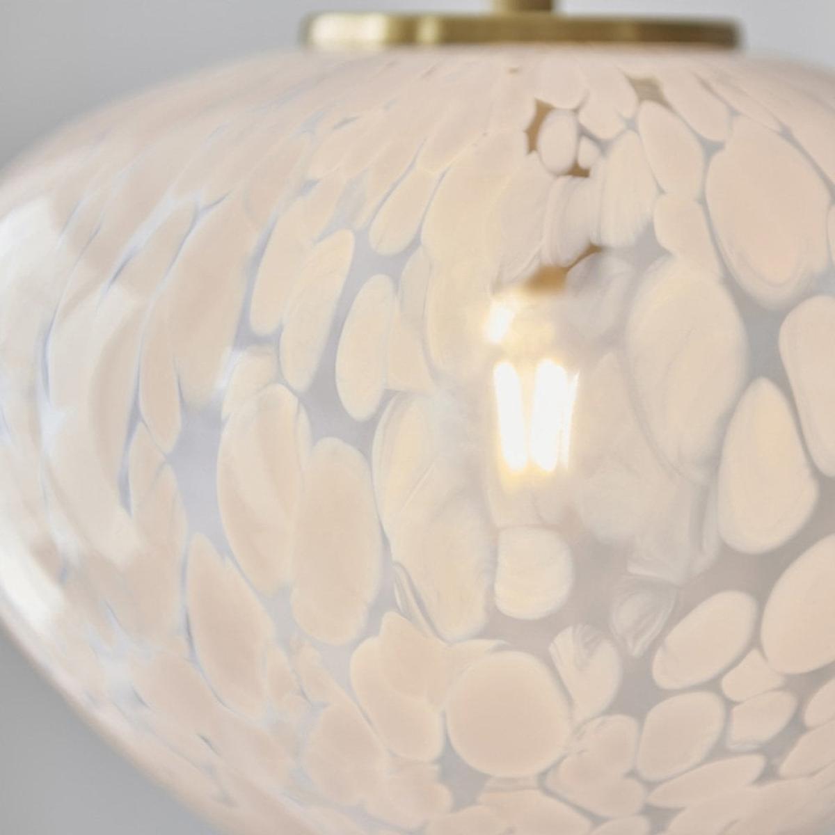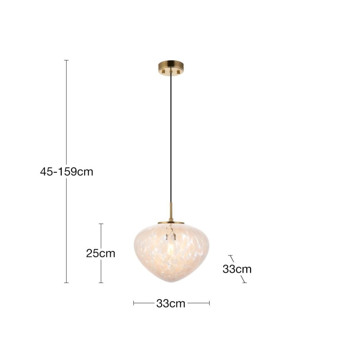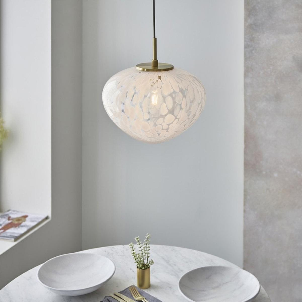 This Isla pendant light combines the beauty of blown glass and traditional brass crafts to create a luxury statement piece. The blown glass shade has white confetti glass, complete with a satin brass finished ceiling plate. This pendant can be adjusted in height depending on your requirements with a dimmable feature.