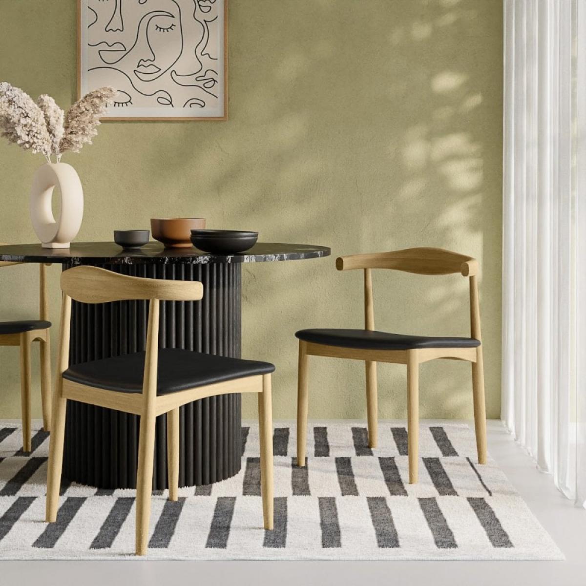 Scandinavian style that is always on-trend. The Aalborg dining chair features a faux leather black seat, curved backrest, and a smooth natural ash wood frame. This timeless piece will elevate any dining room or kitchen space - giving it character and a touch of Scandic charm. View The Aalborg Range