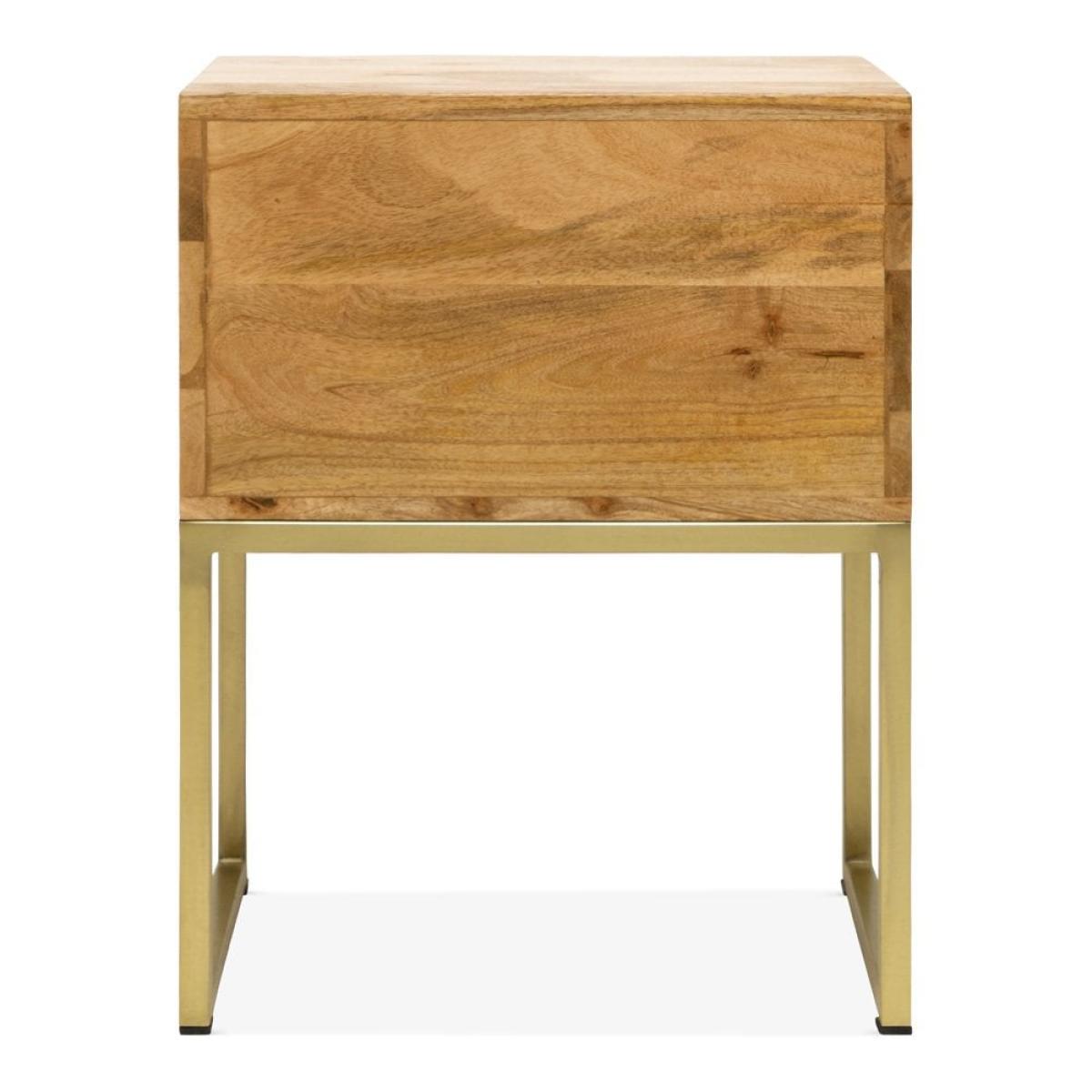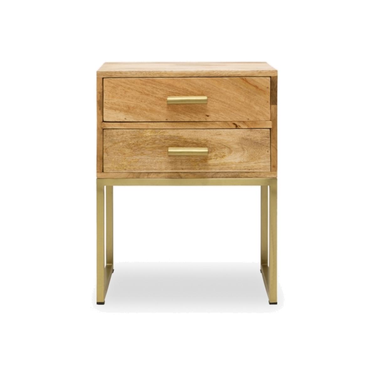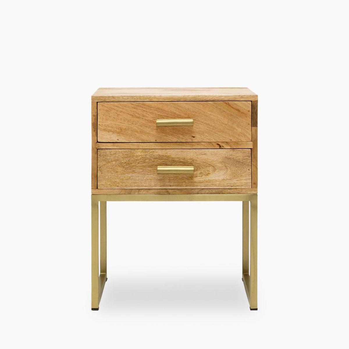 Solid wood meets industrial style with the Orson bedside table. Showcasing a clean profile with brushed brass iron legs and a smooth wooden top. This two drawer side table provides a sleek modern storage solution for your hallway, bedroom or living room.  View The Orson Range This product is handcrafted, making each piece unique with naturally occurring texture, pattern, and colour. The natural materials used makes this product special and unique to you.   Mango trees reach maturity in approximately 15 years making them one of the fastest-growing hardwoods. Towards the end of these years, the tree produces less fruit and can be harvested for furniture, making use of the full lifecycle of the tree. Due to Mango Wood’s strength, it is also just as durable as solid woods.