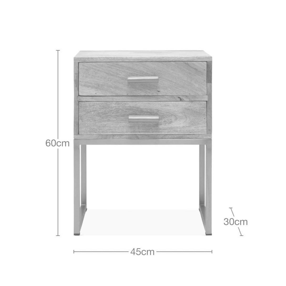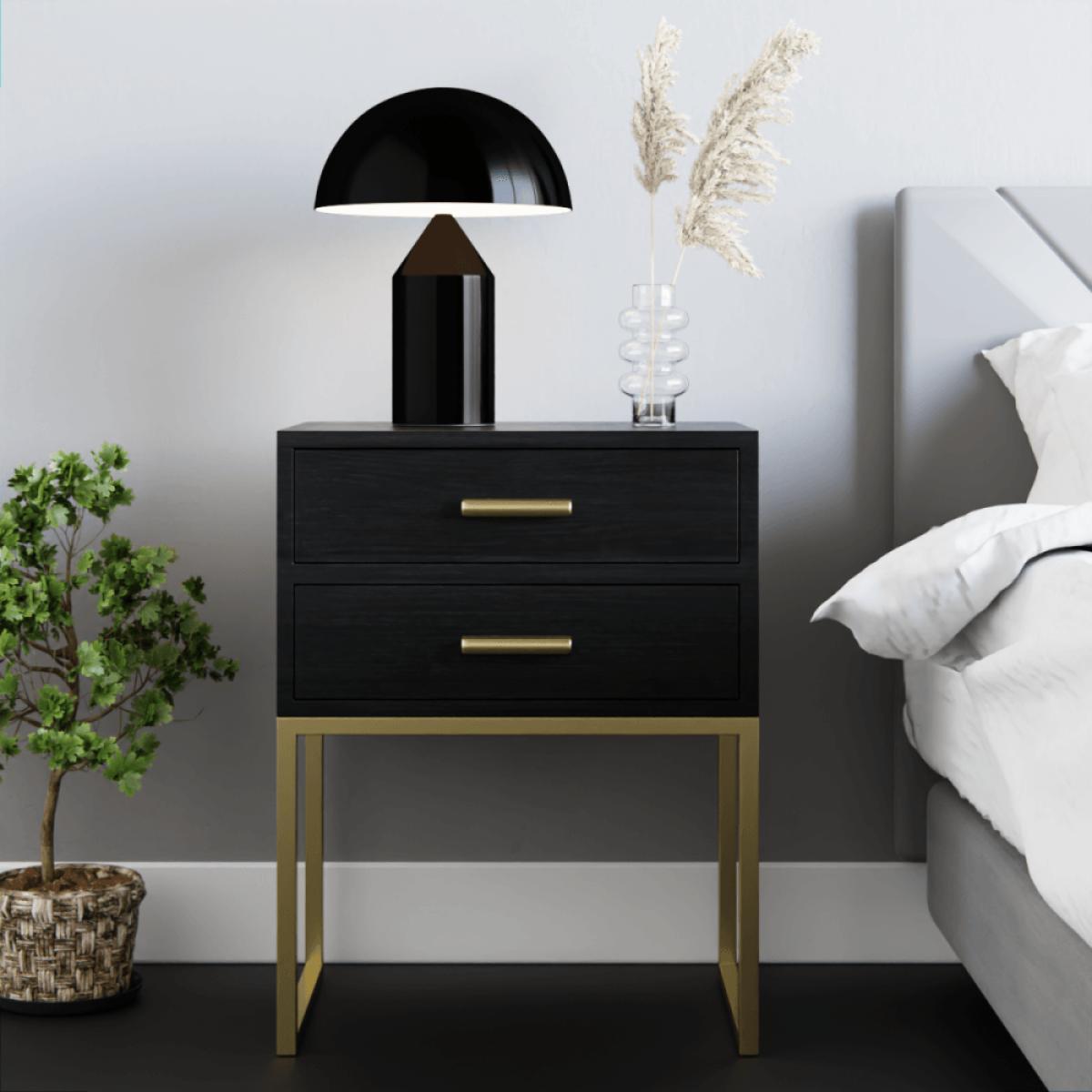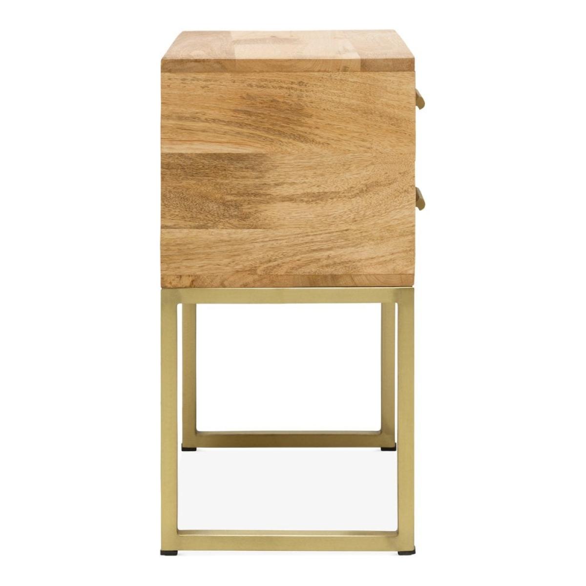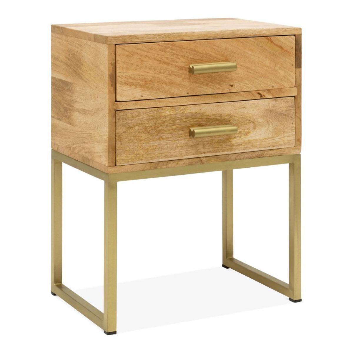 Solid wood meets industrial style with the Orson bedside table. Showcasing a clean profile with brushed brass iron legs and a smooth wooden top. This two drawer side table provides a sleek modern storage solution for your hallway, bedroom or living room.  View The Orson Range This product is handcrafted, making each piece unique with naturally occurring texture, pattern, and colour. The natural materials used makes this product special and unique to you.   Mango trees reach maturity in approximately 15 years making them one of the fastest-growing hardwoods. Towards the end of these years, the tree produces less fruit and can be harvested for furniture, making use of the full lifecycle of the tree. Due to Mango Wood’s strength, it is also just as durable as solid woods.