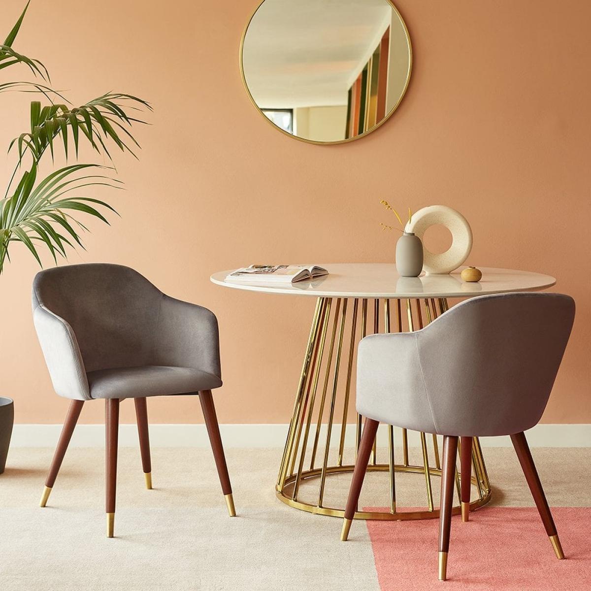 I love this quirky mustard velvet dining chair for adding colour and texture to a range of interiors. Its walnut legs with gold tips give a touch of sophistication, making it versatile enough for both modern and eclectic spaces. It works particularly well in mid-century inspired or contemporary schemes, where its bold hue can either be a focal point or complement neutral tones. For styling tips, pair it with warm wooden tables or mix with patterned fabrics and cushions to soften its look. It’s practical too, thanks to its comfortable shape and durable velvet upholstery, making it perfect for everyday dining or as an occasional accent chair in a living space.