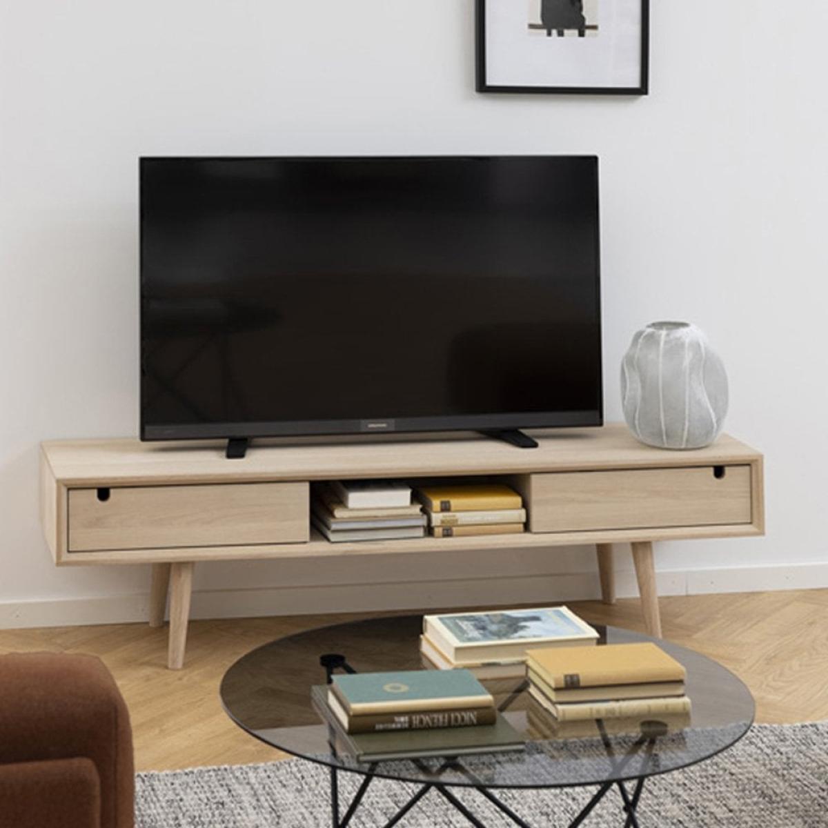 I love this TV stand because of its clean, minimalist design and warm oak finish, which makes it highly versatile for various interiors. It works particularly well in Scandi or contemporary spaces where understated elegance is key. The open shelving and drawers offer practical storage for media devices, remote controls, and décor, while the slightly elevated legs give it a light, airy feel. For styling, I’d suggest adding some decorative books or small plants on top, keeping clutter to a minimum to highlight its sleek silhouette. It also pairs nicely with mid-century or modern furniture pieces, making it a flexible centrepiece for your living room.