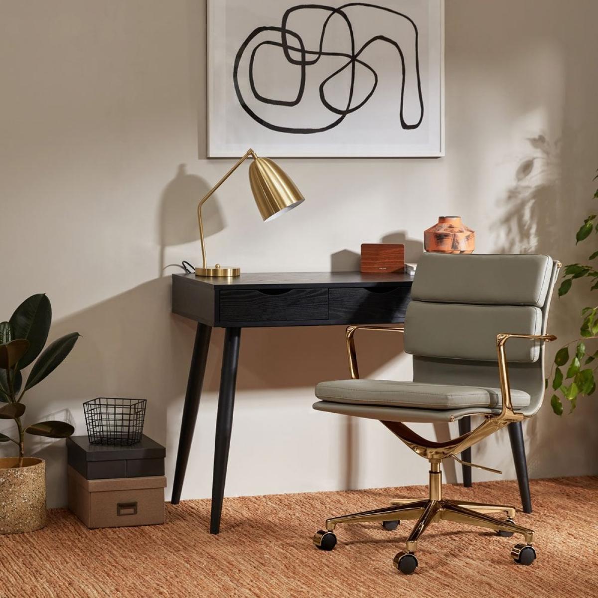 This office chair is a chic choice for adding a touch of modern elegance to your workspace. I love how the soft grey upholstery combined with the brass details creates a sophisticated, contemporary feel that works beautifully in minimalist or luxe interiors. It’s versatile enough to complement neutral tones, light woods, or even darker colour schemes for contrast. As it’s a soft pad design with a low back, it’s perfect for more relaxed or home office setups where comfort and style are equally important. For styling tips, consider pairing it with a sleek desk or a cosy lounge corner, and add some textured accessories like a woven rug or velvet cushions to soften and personalise the look. It’s a great blend of form and function, elevating even small or casual spaces.