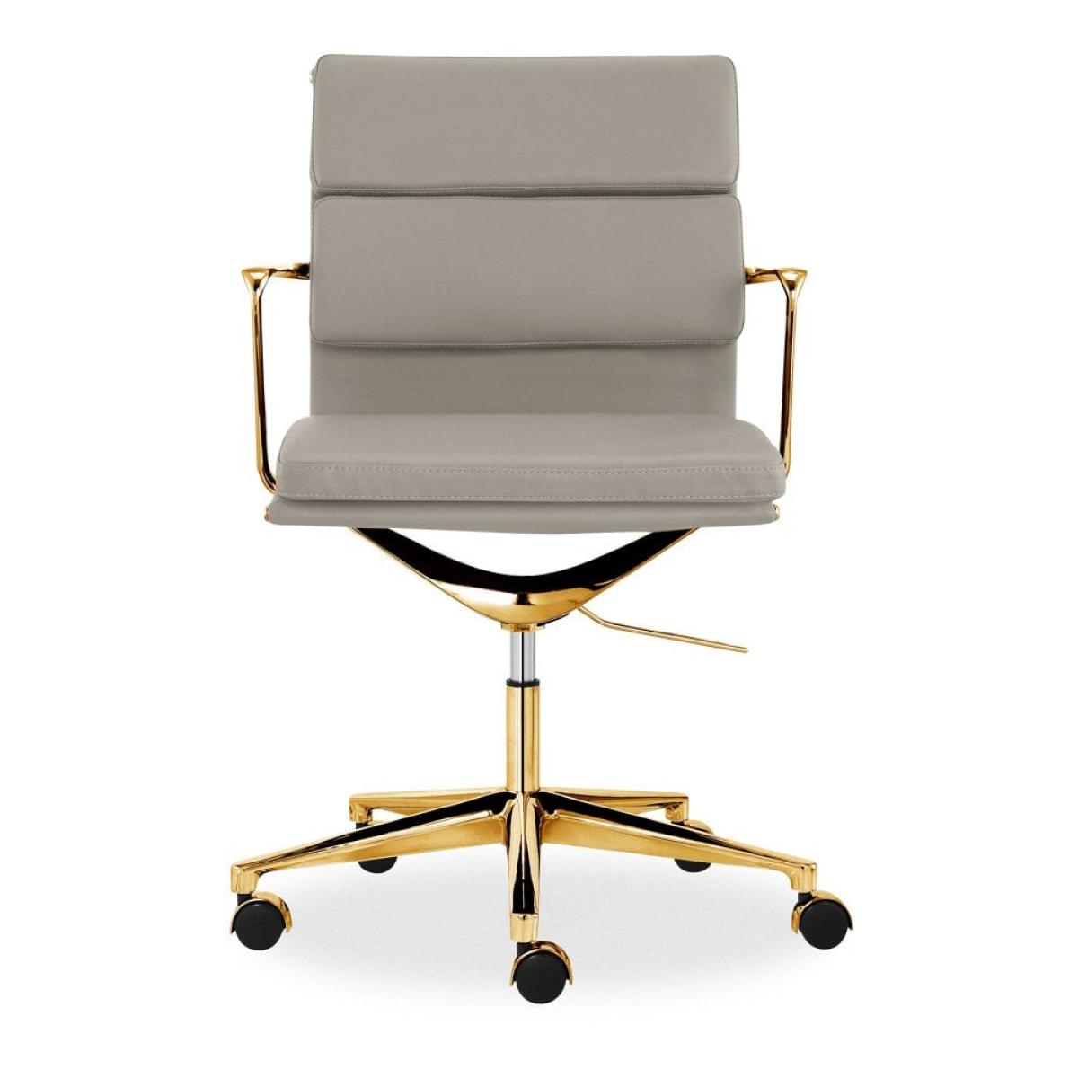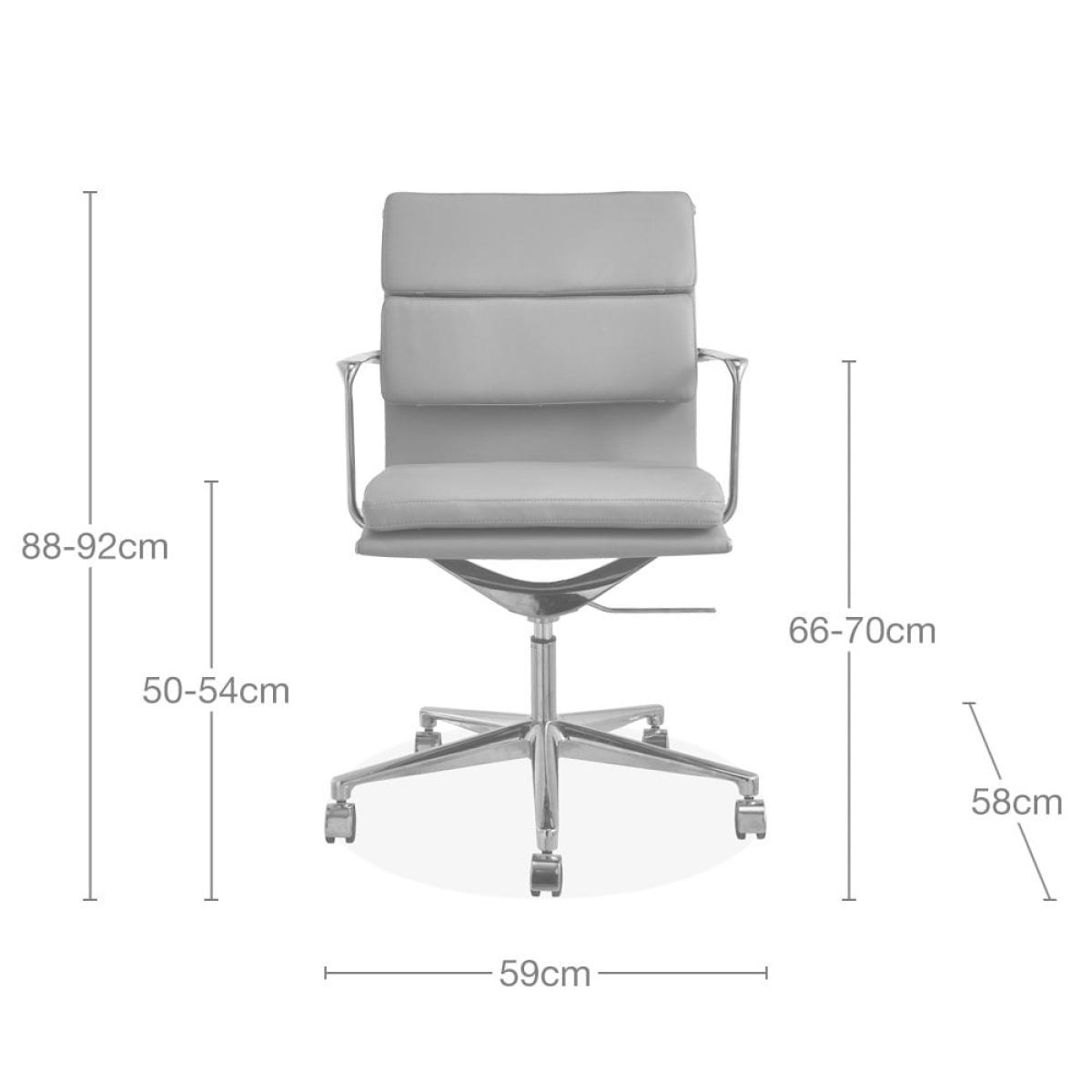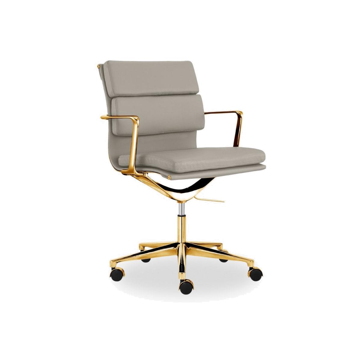Meet the Soft pad office chair with a low back. The smooth light grey faux leather and padded seat provide comfort like no other, while the height-adjustable, swivel brass metal base on wheels makes for an efficient working day. This office chair is a classic design that will never go out of style. View The Soft Pad Office Chair Range