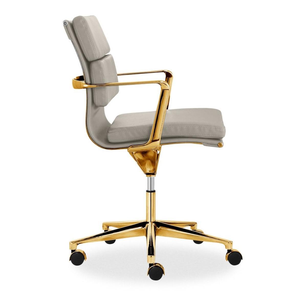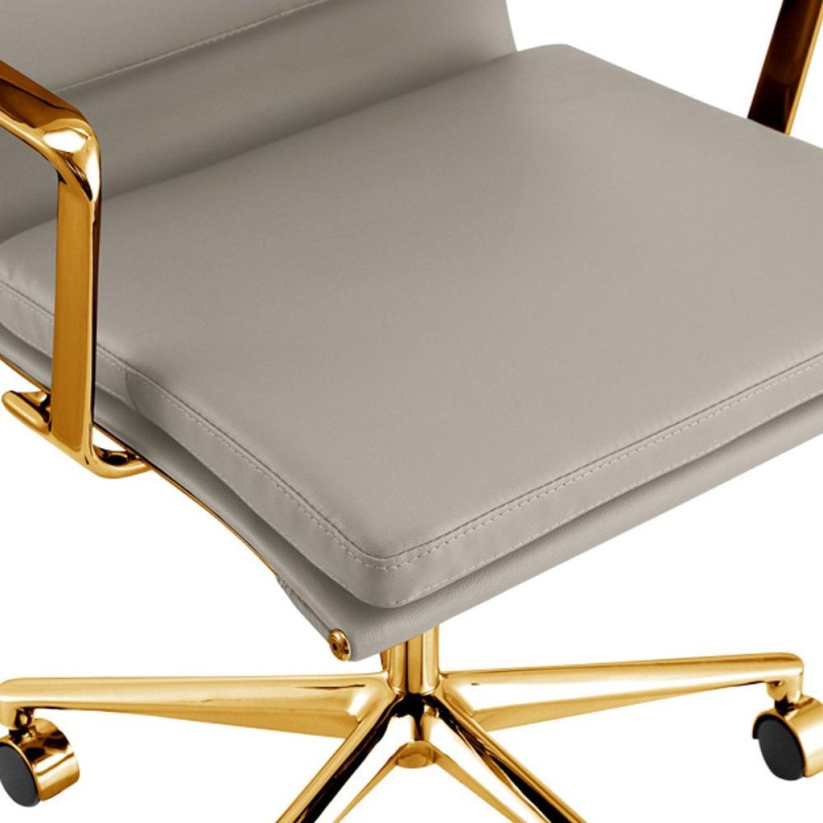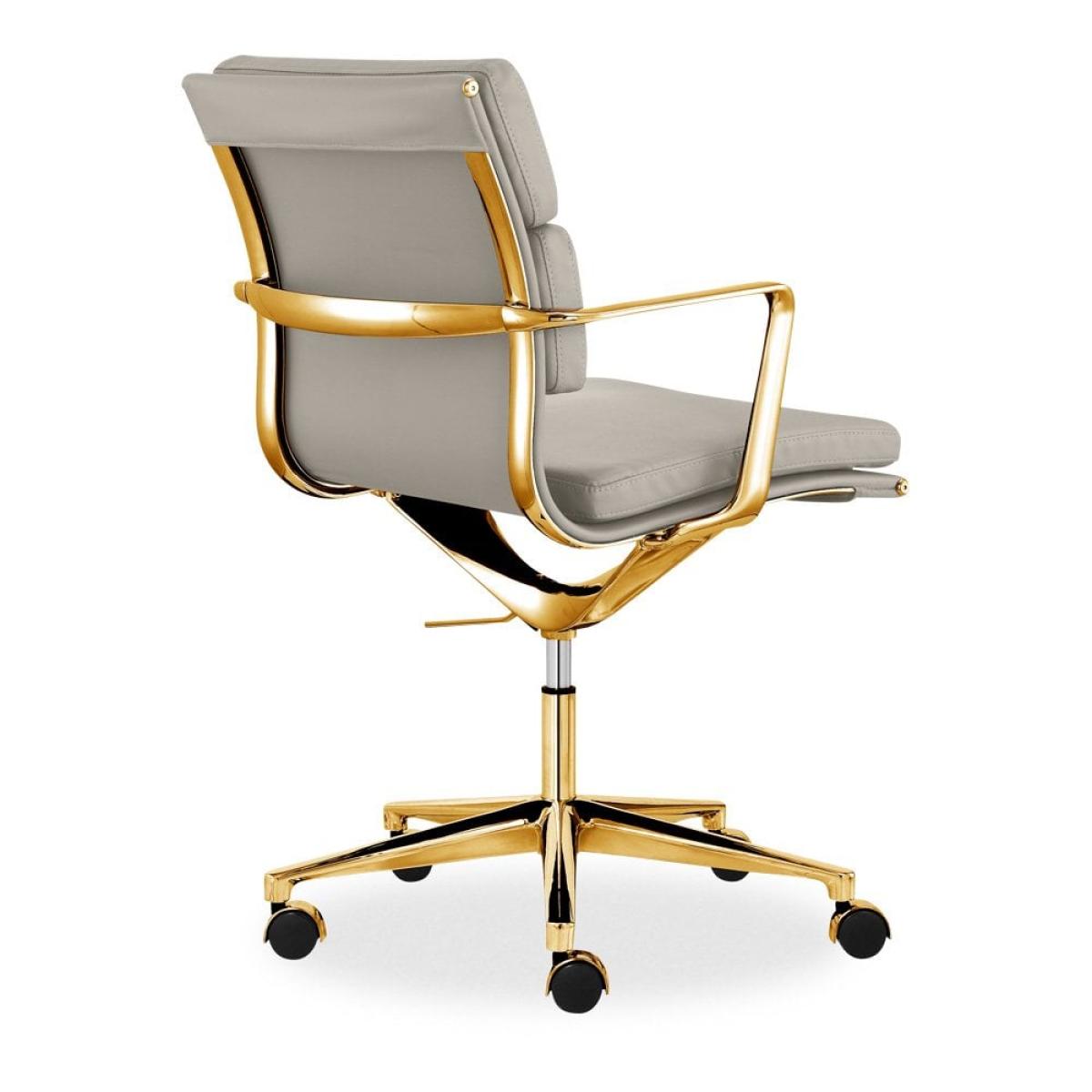 Meet the Soft pad office chair with a low back. The smooth light grey faux leather and padded seat provide comfort like no other, while the height-adjustable, swivel brass metal base on wheels makes for an efficient working day. This office chair is a classic design that will never go out of style. View The Soft Pad Office Chair Range