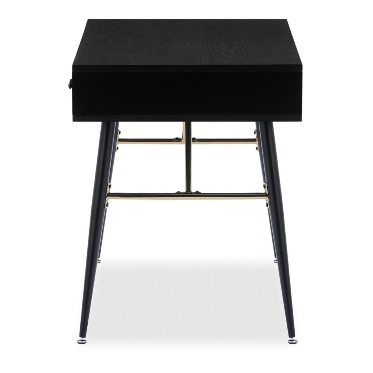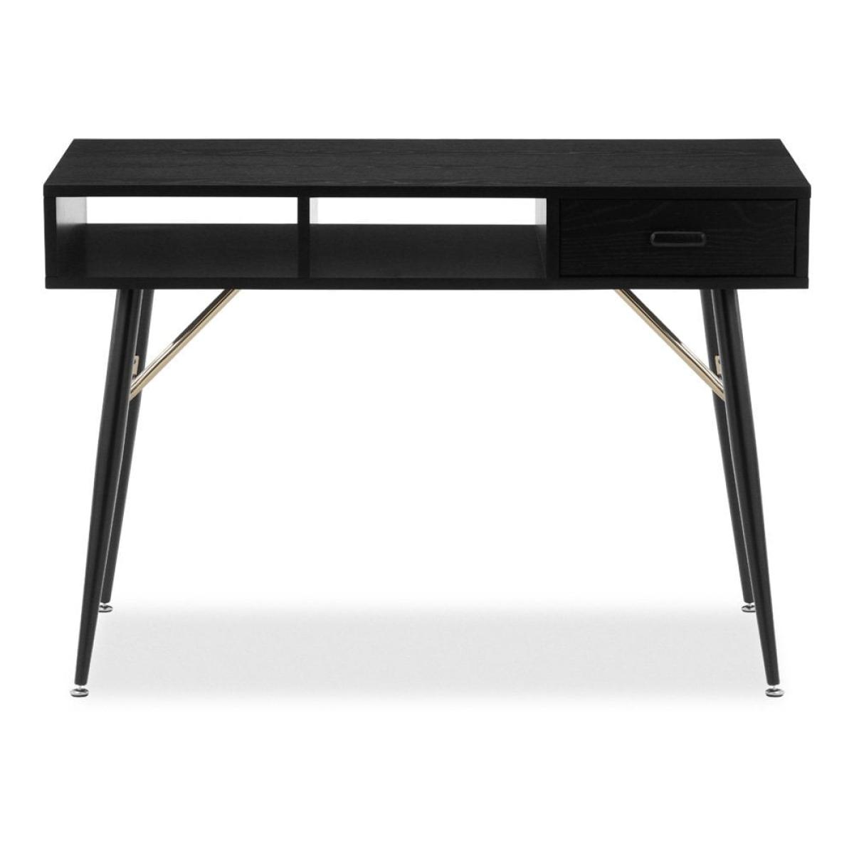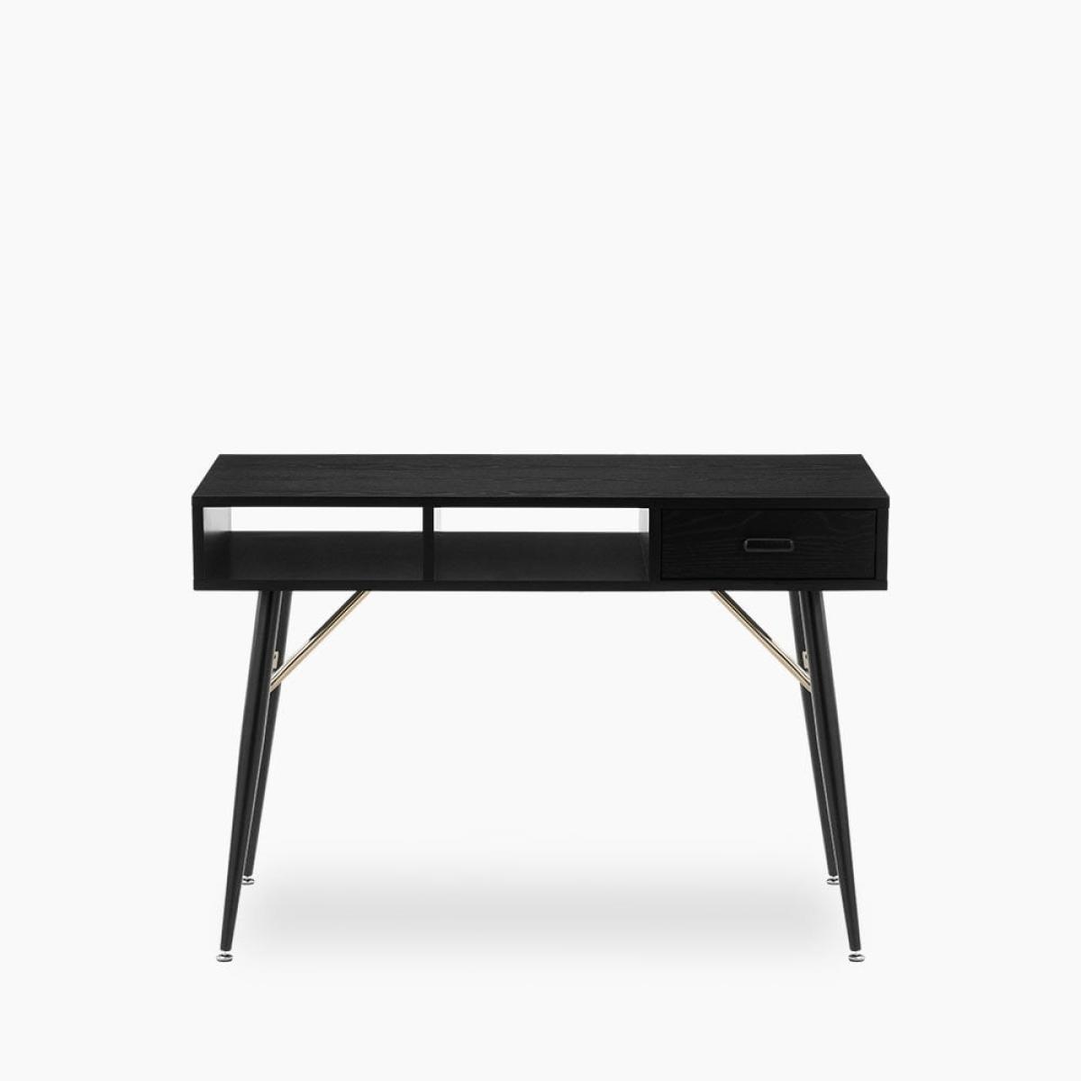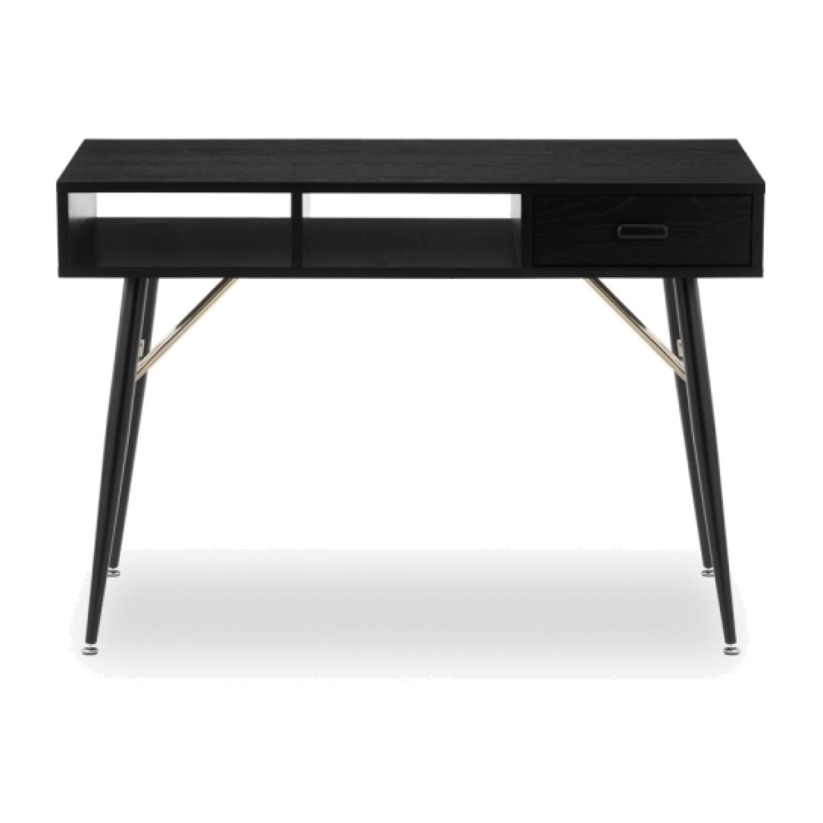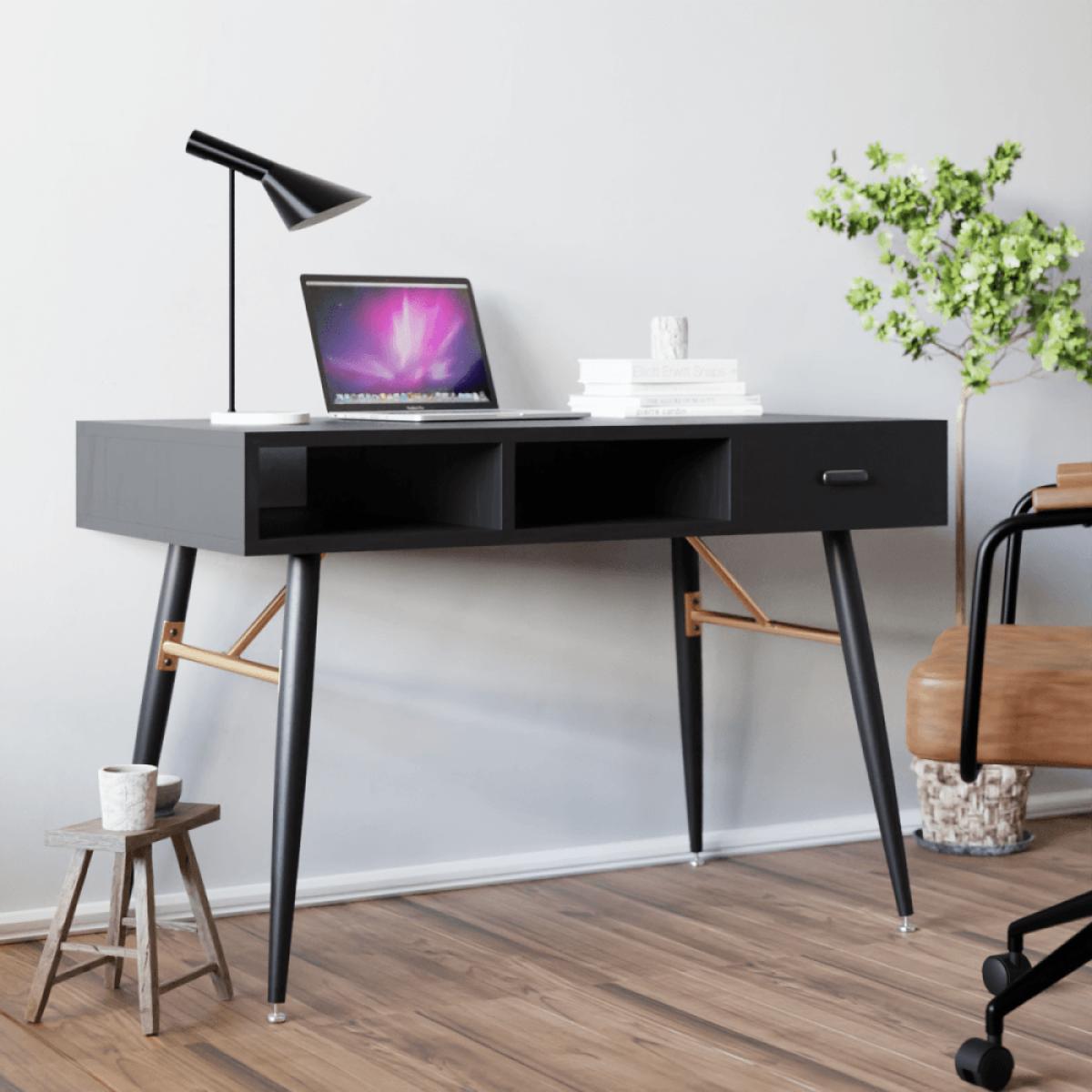 Needing an upgrade to the home office, or workspace? Our Holbrook Desk has a convenient drawer and two additional slots for storing paperwork. The black and gold frame gives it a hyper trendy look and is perfectly match with any modern office chair. The stained black finish and the gold chrome brackets make this desk stand out from the crowd. With hints of art deco design, this desk seamlessly gives your space a touch of subtle mid-century class and will suit velvet as well as leather chairs.