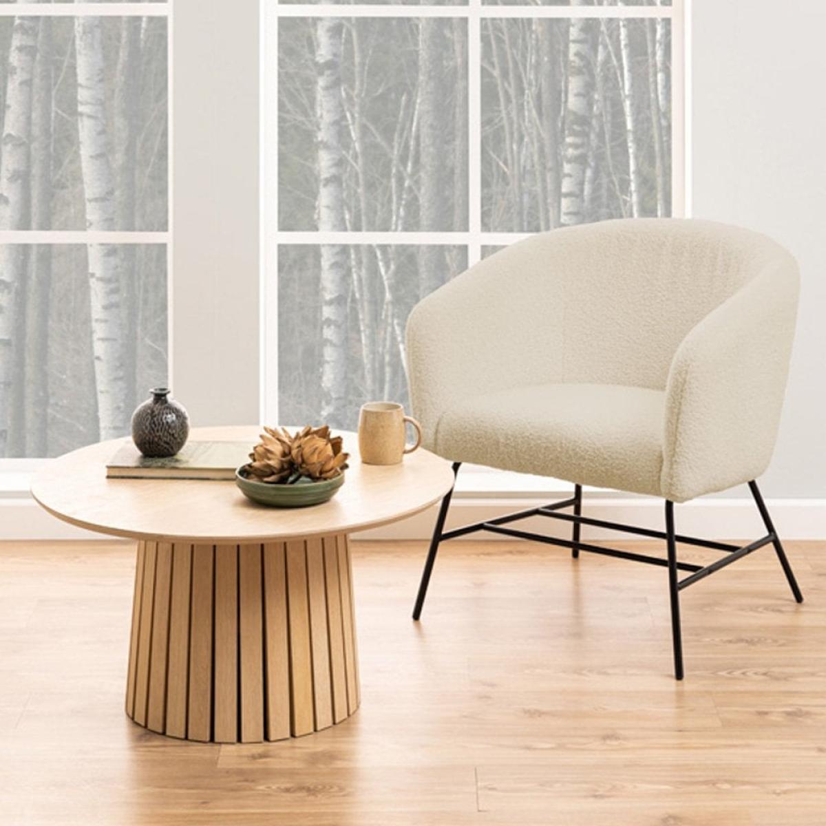 I love this round coffee table because of its clean, minimalist design and warm light oak finish, which makes it versatile enough to complement a range of interiors. It works particularly well in modern, Scandinavian, or contemporary spaces, adding a touch of natural warmth without overpowering the room. Styling tips include using it as a focal point with a few carefully chosen accessories-such as a small arrangement of greenery, a stack of design books, or decorative bowls-to enhance its understated elegance. Its sturdy, sculptural base also makes it practical for casual living areas, providing a balanced mix of functionality and aesthetic appeal.