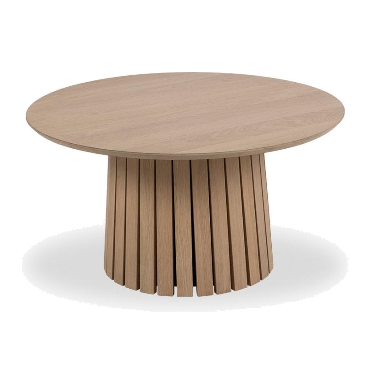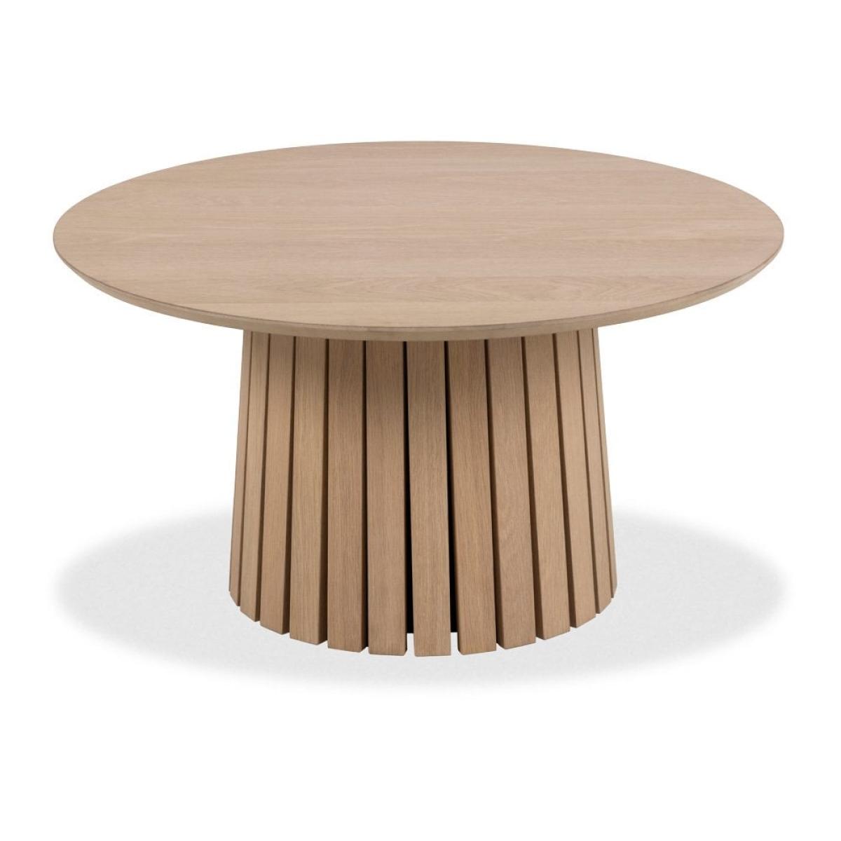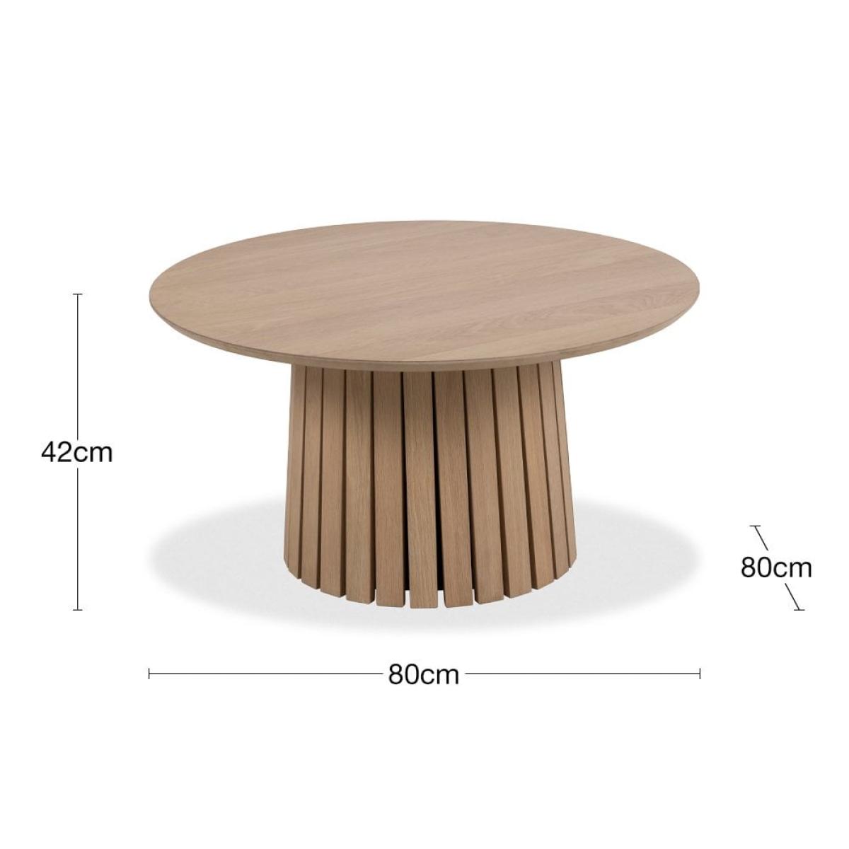 The Christo Round Coffee Table is a celebration of Scandinavian design, inspired by its simple and modern form to create a warm and inviting atmosphere. The sturdy conical-shaped base has been enhanced with aesthetic slats, while the round spacious tabletop in beautiful matte lacquered oak veneer finish offers plenty of room for drinks, magazines, and other living room home decor. Please Note: this table has an MDF underside edge allowing us to create a more slim-lined flying top effect. From a general view, this will not be noticed.