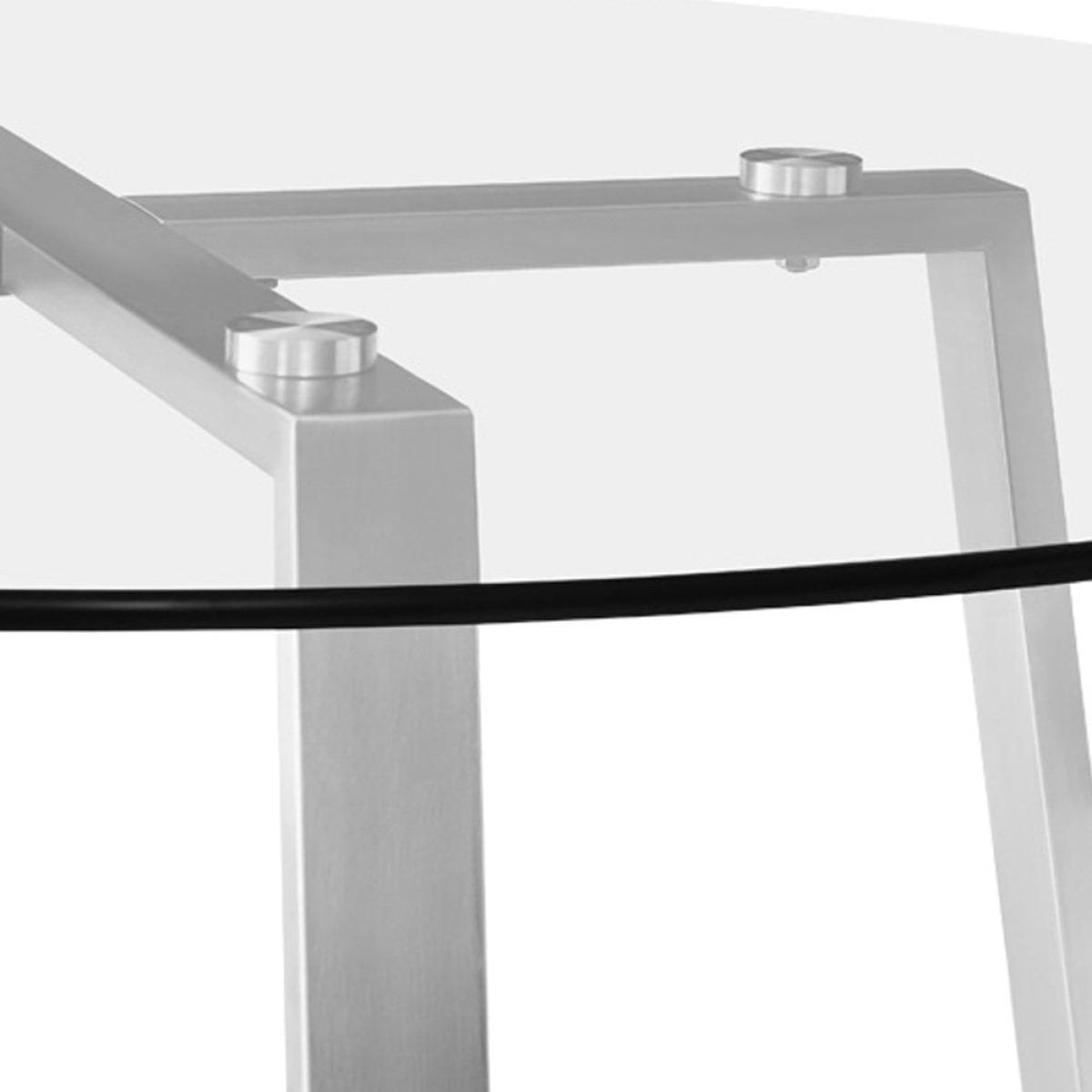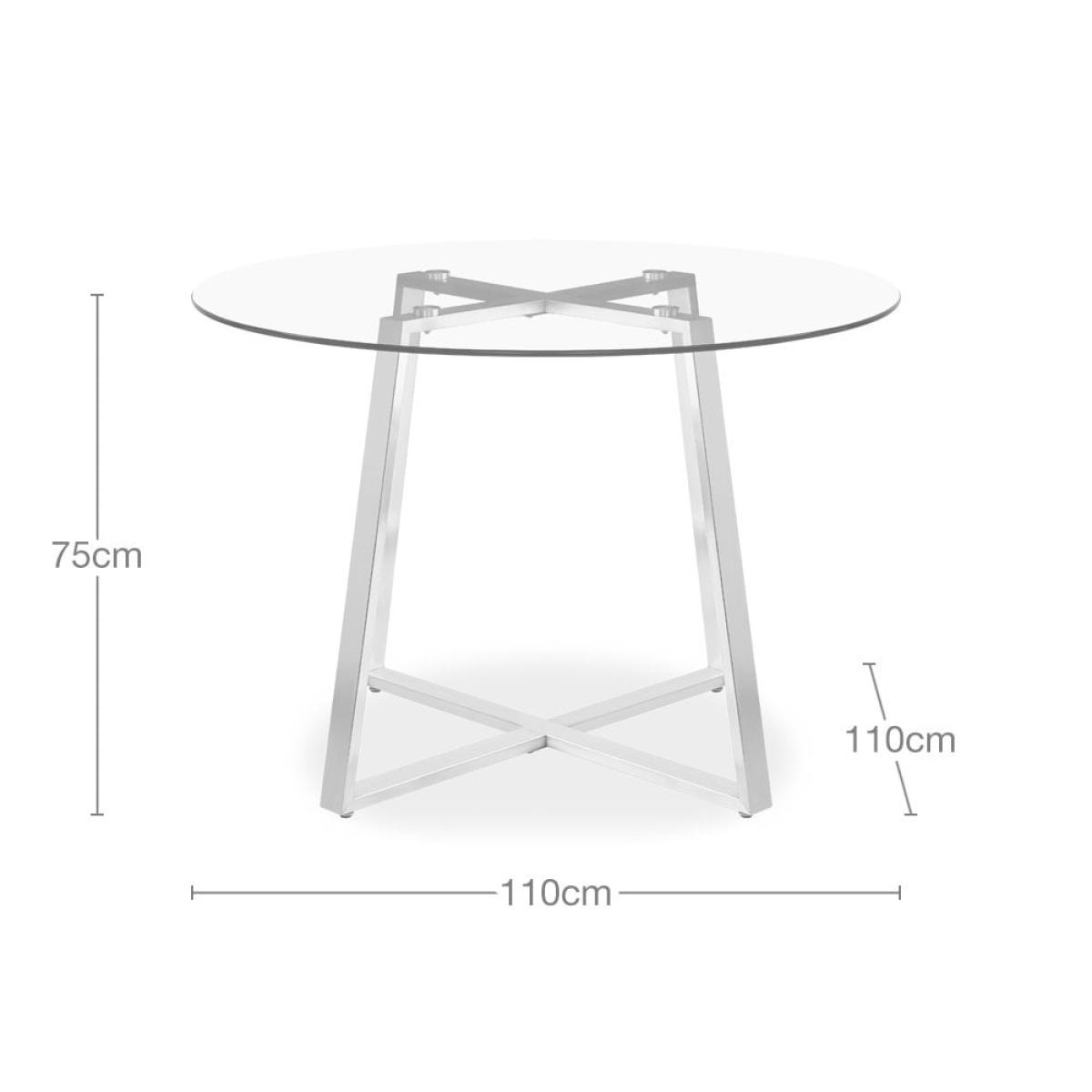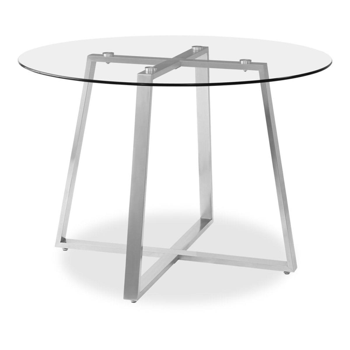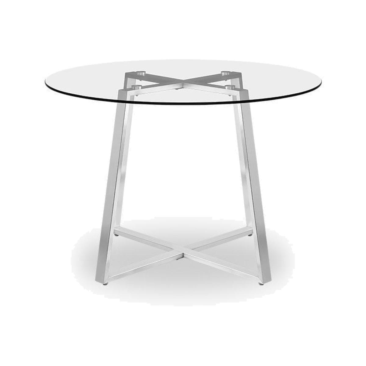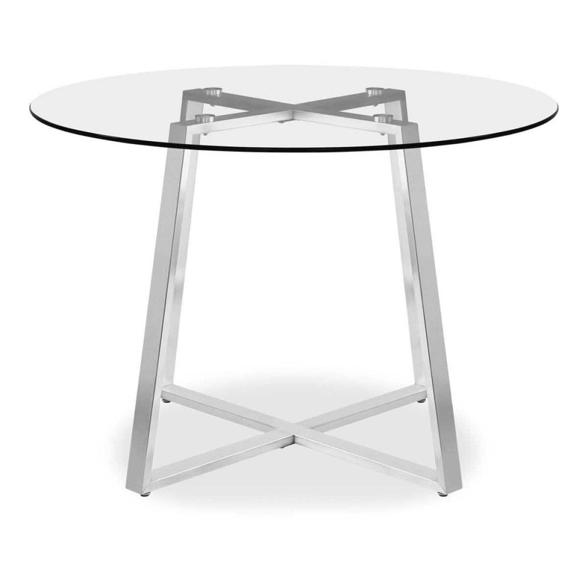 Gather around the Giles dining table with its round glass top and a sleek, criss-cross brushed metal base; a sculptural focal point for your kitchen or dining room. Showcasing a contemporary design that will add an elegant touch to your dining space.