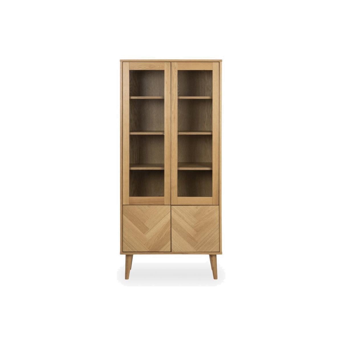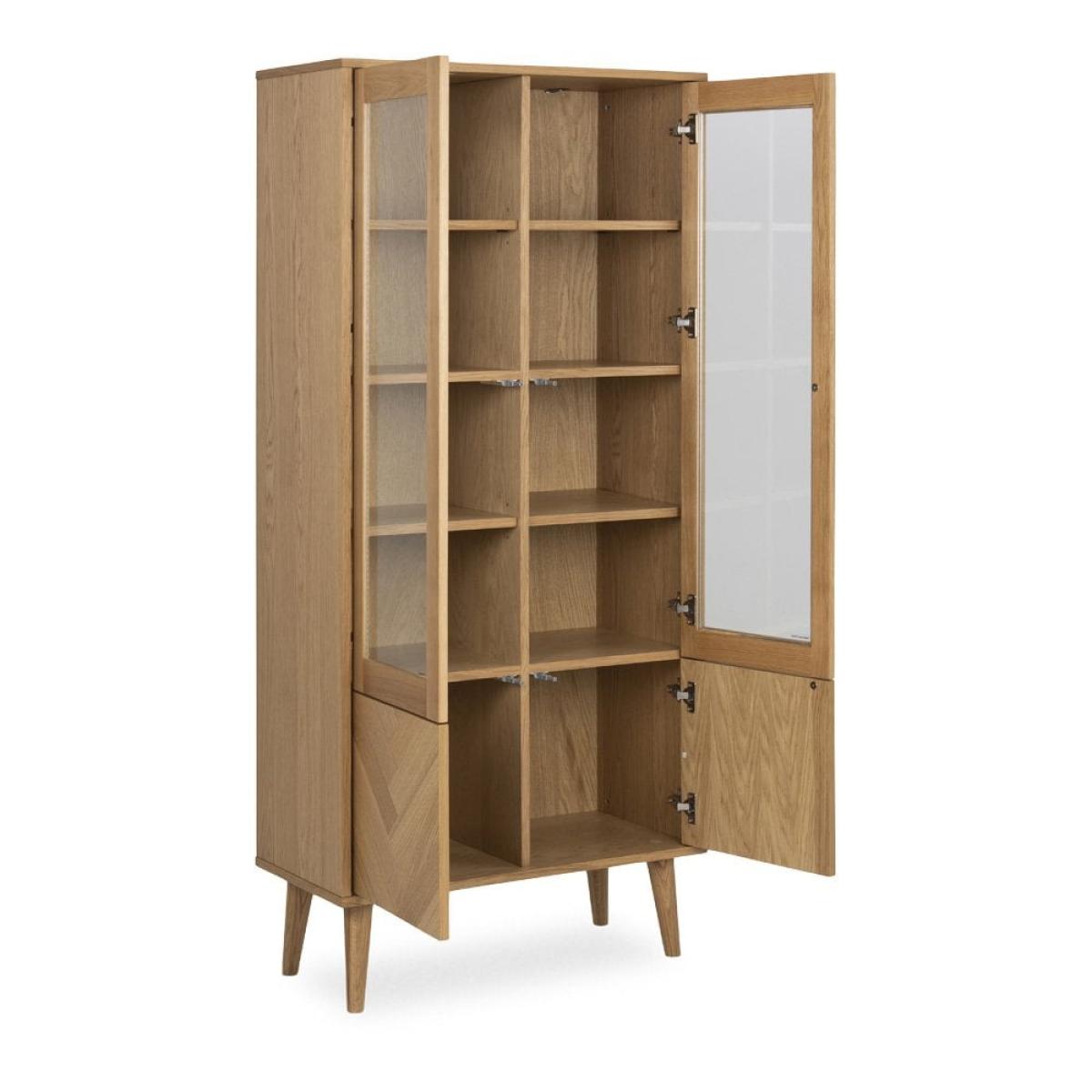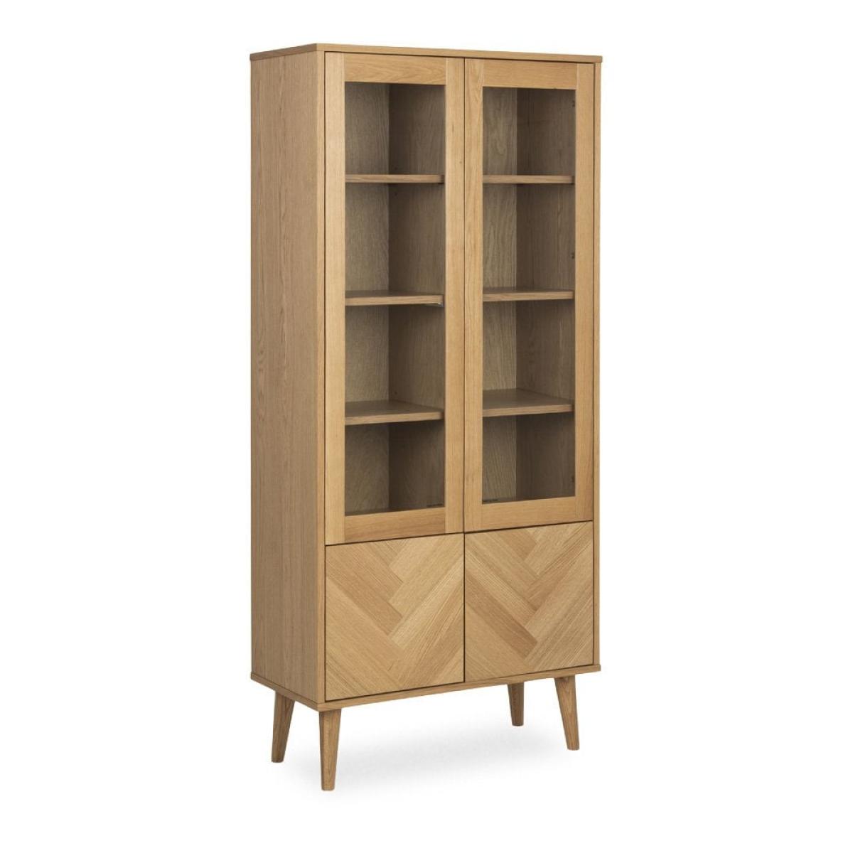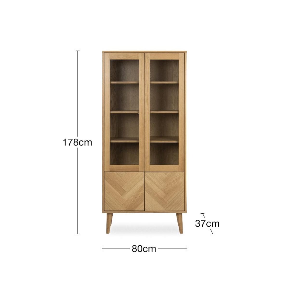A classic piece of furniture, this cabinet has a unique herringbone pattern in high quality oak veneer with integrated handles. The push to open feature makes opening and closing the doors very easy, whilst the precious inner contents remain safe. With three shelves and two cupboard doors, there is plenty of storage space for your household items. This classic nordic design will blend perfectly in any home.