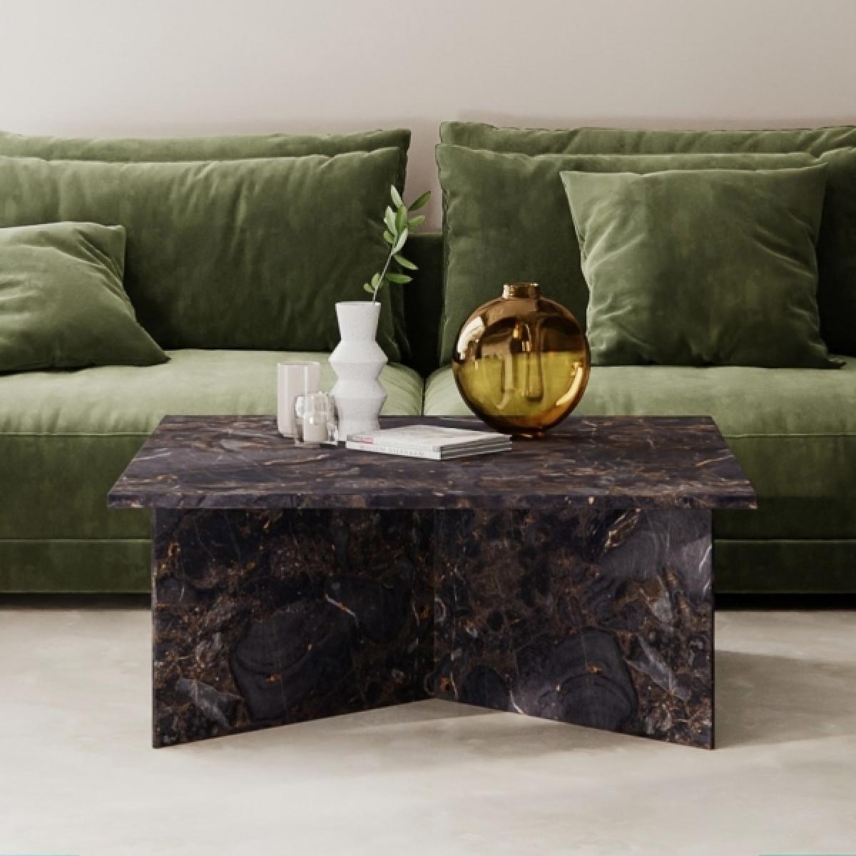 I’d call this the Vega marble coffee table - its clean lines and dark brown veining give it real presence without overwhelming a room. It’s at home in both contemporary loft spaces and more traditional living rooms, pairing neatly with leather sofas or linen-covered armchairs. For a simple, lived-in look, layer a couple of coffee-table books, add a low vase with greenery and a small brass or ceramic tray. The polished marble top is hardwearing and easy to wipe down, so it’s as practical as it is stylish.