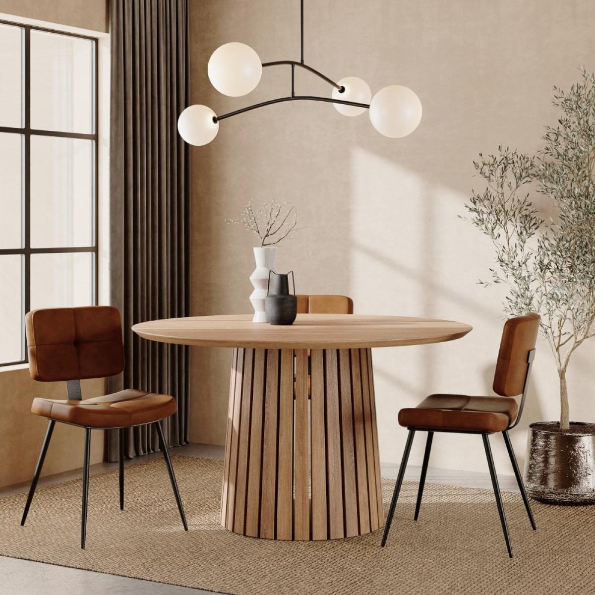 I love this round oak table for its clean, contemporary shape with a hint of Scandinavian influence. It works well in both modern and mid-century inspired interiors, adding warmth and texture to the dining space. Its versatile design makes it suitable for smaller kitchens or open-plan living areas, especially when paired with minimalist chairs or even a mix of different styles for an eclectic look. Practical styling tips include adding a centrepiece or a runner to soften the overall look, and pairing it with cushion-framed chairs to make it more inviting for everyday use. Its sturdy construction and timeless appeal mean it can easily be dressed up or down depending on your chosen décor.