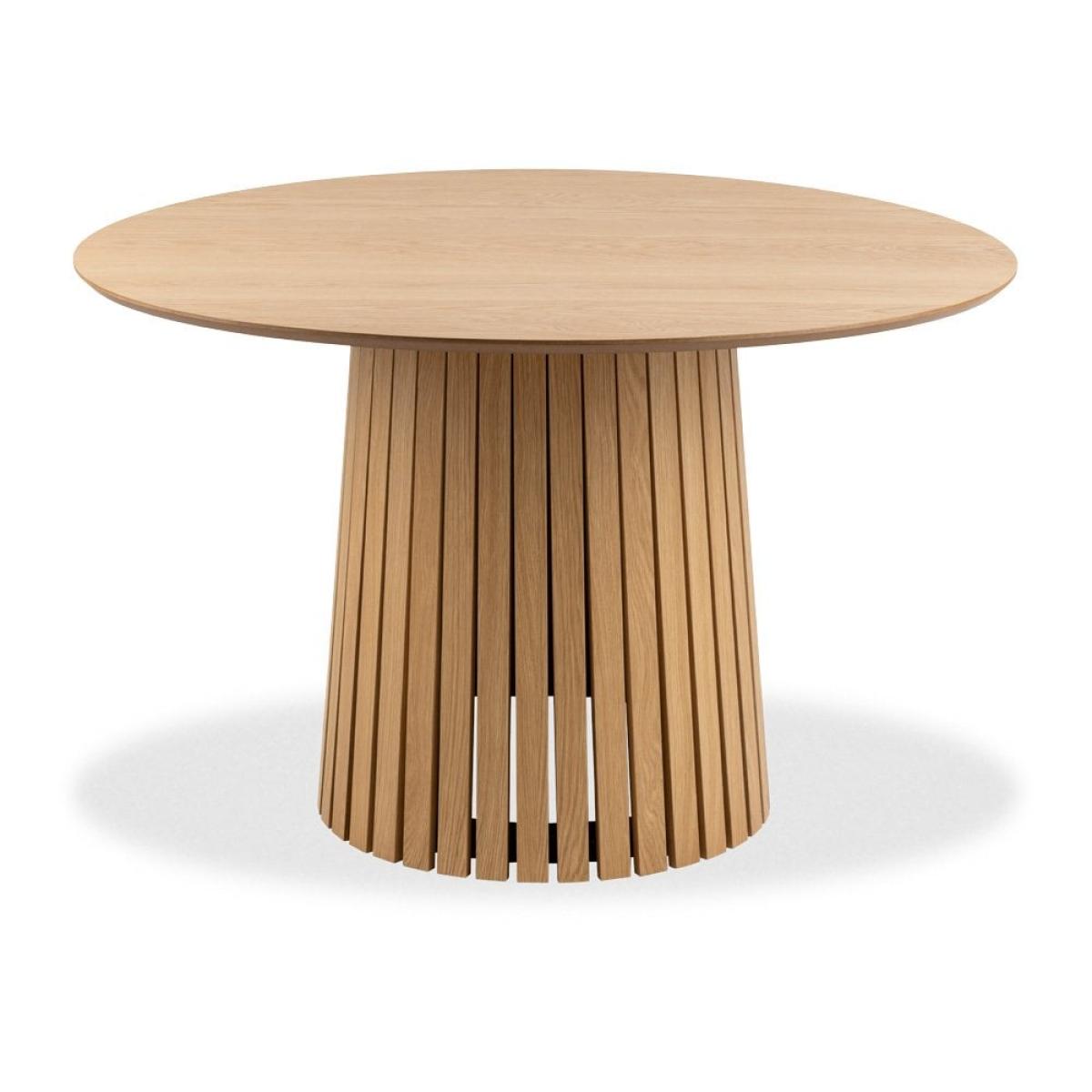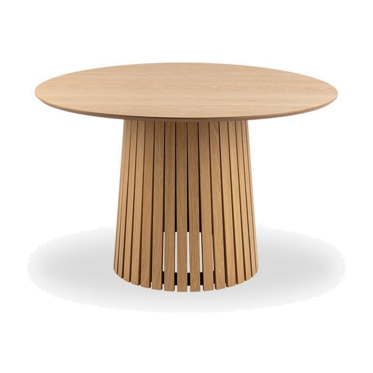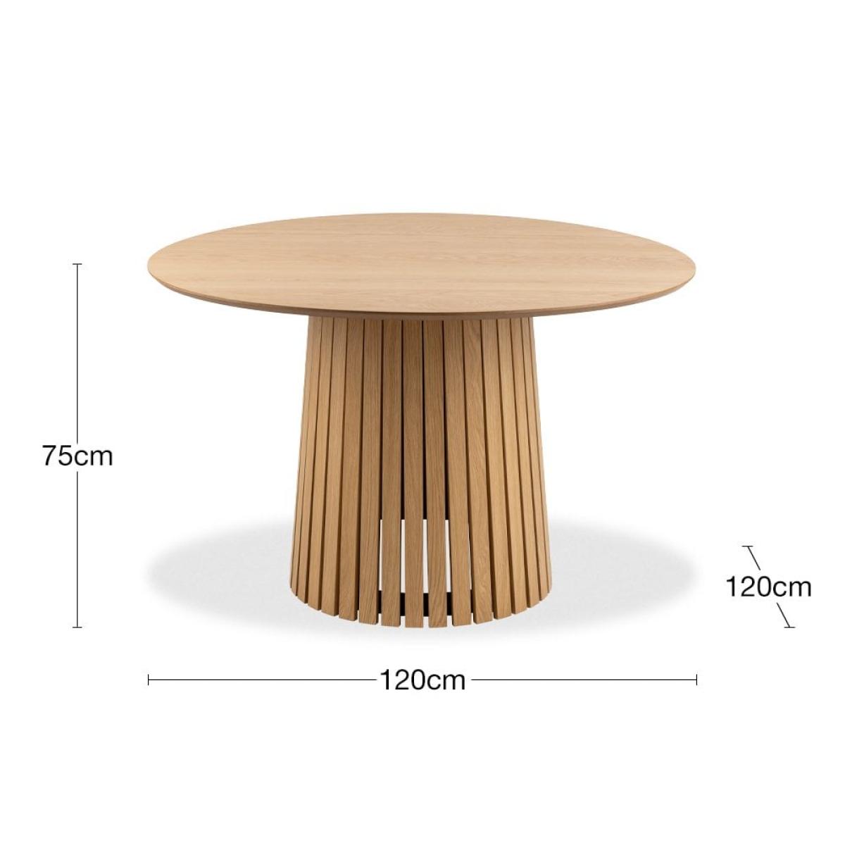 The Christo 4 Seat Round Dining Table is a celebration of Scandinavian design, inspired by its simple and modern form to create a warm, inviting atmosphere. The sturdy conical-shaped base has been enhanced with aesthetic slats, while the round spacious tabletop in beautiful matte lacquered oak veneer finish, comfortably sits 4 people. Please Note: this table has an MDF underside edge allowing us to create a more slim-lined flying top effect. From a general view, this will not be noticed. Please Note: this table has an MDF underside edge allowing us to create a more slim-lined flying top effect. From a general view, this will not be noticed.